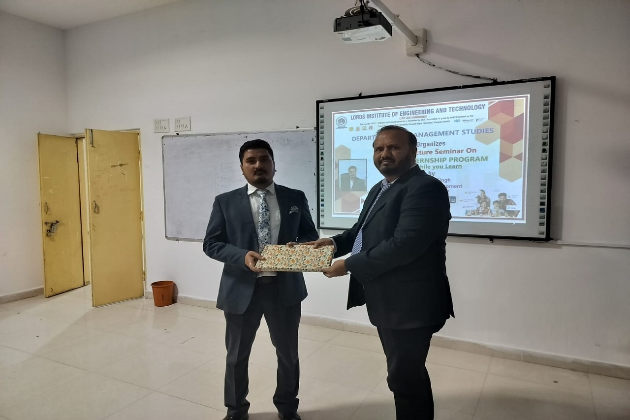 Description about the event: The MBA Department of LIET has organized a Expert Lecture Seminar on Elevate Internship Program (Earn while you learn) on 16th November 2024 from 12:30pm to 2:00 pm under Convenor Dr. Ashfaq Hussain HOD and Coordinator Ms .N. Durga Rani. The resource person of the program Mr. Dhrub Singh Sr. Business Development at Invest4Edu has 10 years of experience in hospitality and education handling sales team at invest4Edu offered students a unique opportunity to gain practical business insights while earning. The program emphasized hands-on experience in business development, client handling, and market strategies, preparing students for real-world challenges while supporting financial independence.