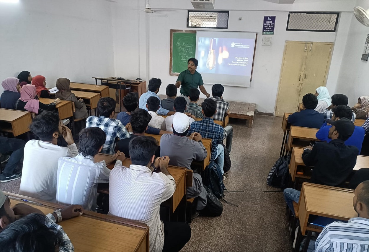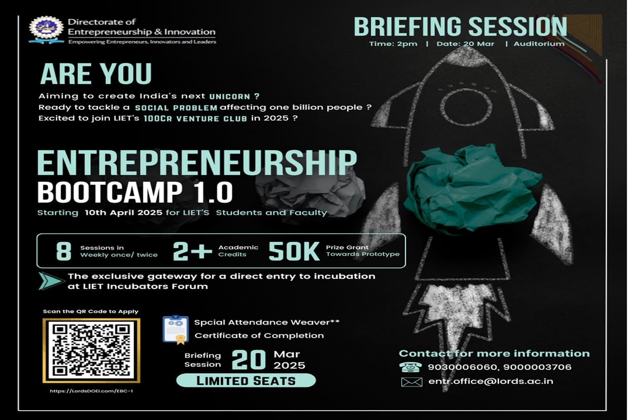 Description: Briefing Session on Entrepreneurship Bootcamp 1.0 to all the Lords Students was conducted by Mr.Udyan Bakshi, Directorate of Entrepreneurship and Innovation, LIET(a). All the students were informed about the Bootcamp which is going to start from the 10th April 2025 which includes eight sessions in a week, 2+ Academic Credits and Rupees 50K Prize Grant towards Prototype.