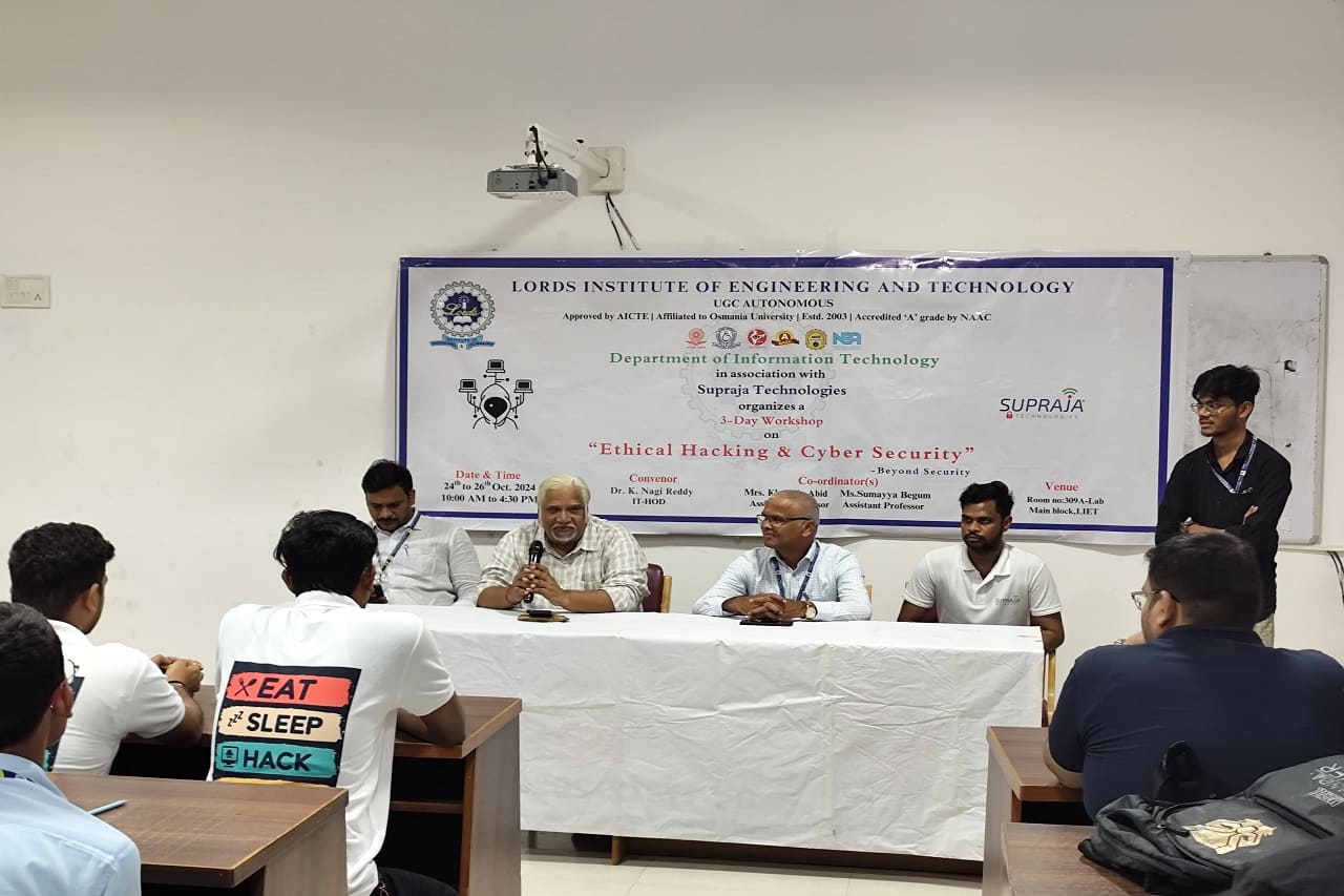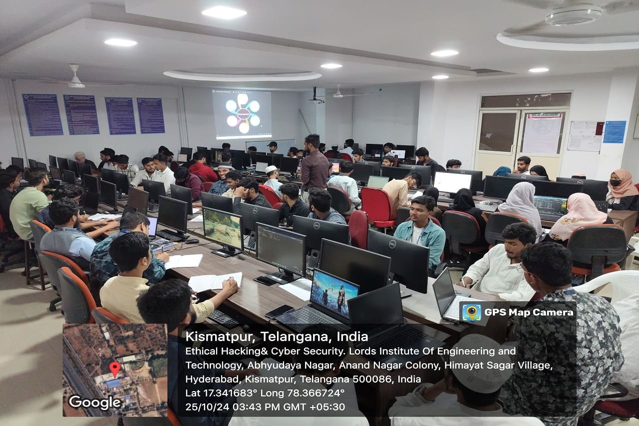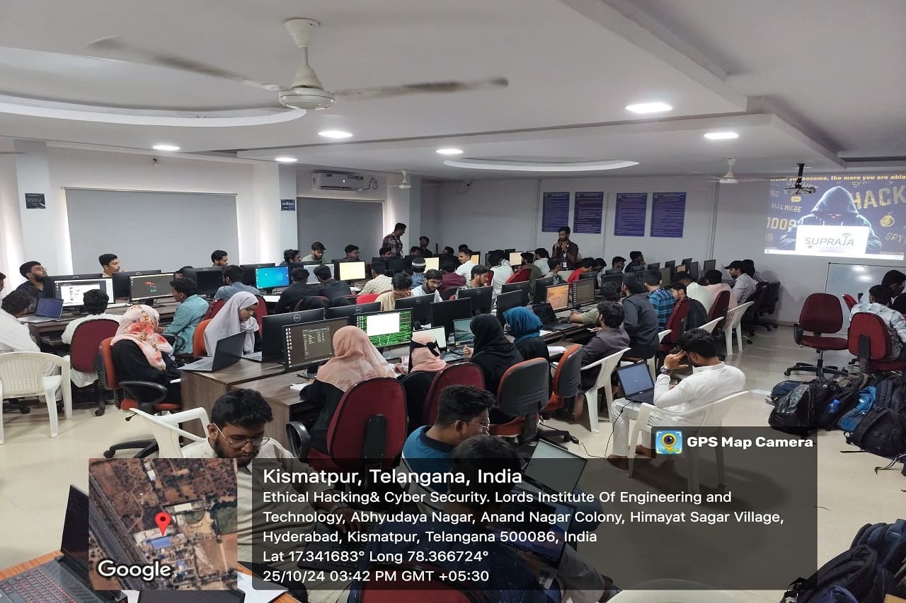Description: The Workshop on “Ethical Hacking and Cyber Security – Beyond Security” was organized by IT Department on 24th & 26th October 2024 from 10AM to 4:30 PM at Lords Institute of Engineering and Technology. The Workshop on “Ethical Hacking and Cyber Security – Beyond Security” was conducted for the benefit of Third-Year Students. The resource person of the workshop is Mr. Krishna, Lead Trainer at Supraja Technologies, Vijayawada . The main aim of Workshop is to provide a Hands-on experience to students on Cyber Security. It involves various tools and techniques to handle cybercrime and cyber-attacks. This workshop will be useful in the placement activities. The event was graced by the Principal Dr.Ravi Kishore Singh, Dean IQAC Dr. Ch Santhan Kumar, & Convener, HOD –IT, Dr. K. Nagi Reddy. The session was appreciated by the students. 89 Students have actively participated in the session.