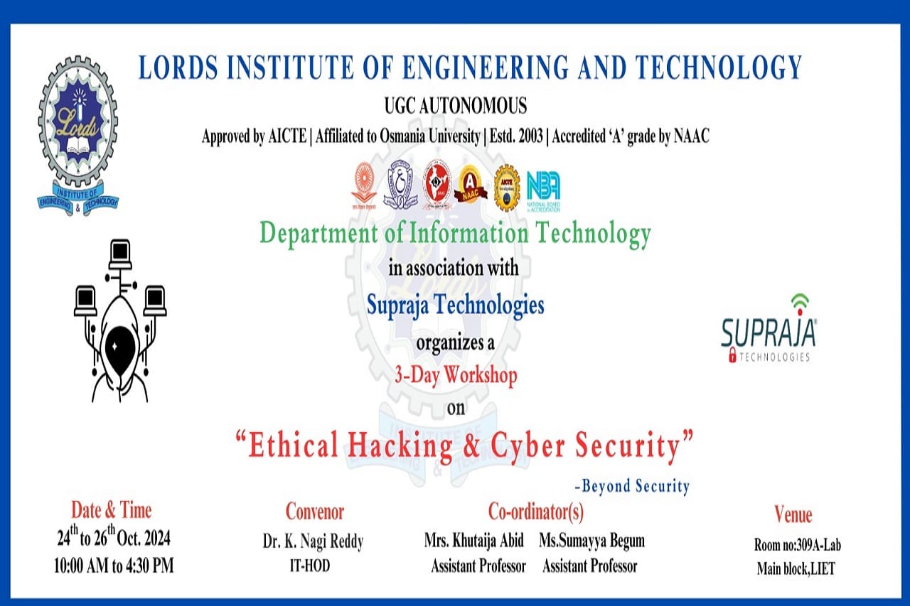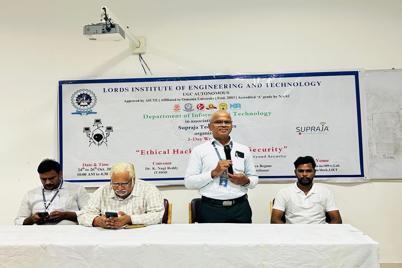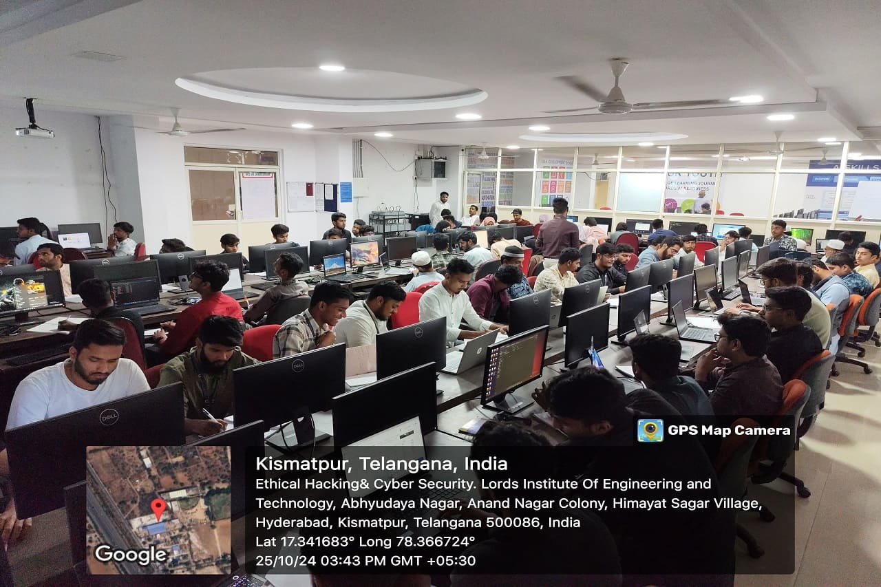 Description: The Workshop on “Ethical Hacking and Cyber Security – Beyond Security” was organized by IT Department on 24th & 26th October 2024 from 10AM to 4:30 PM at Lords Institute of Engineering and Technology. The Workshop on “Ethical Hacking and Cyber Security – Beyond Security” was conducted for the benefit of Third-Year Students. The resource person of the workshop is Mr. Krishna, Lead Trainer at Supraja Technologies, Vijayawada . The main aim of Workshop is to provide a Hands-on experience to students on Cyber Security. It involves various tools and techniques to handle cybercrime and cyber-attacks. This workshop will be useful in the placement activities. The event was graced by the Principal Dr.Ravi Kishore Singh, Dean IQAC Dr. Ch Santhan Kumar, & Convener, HOD –IT, Dr. K. Nagi Reddy. The session was appreciated by the students. 89 Students have actively participated in the session.