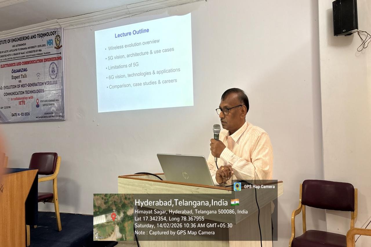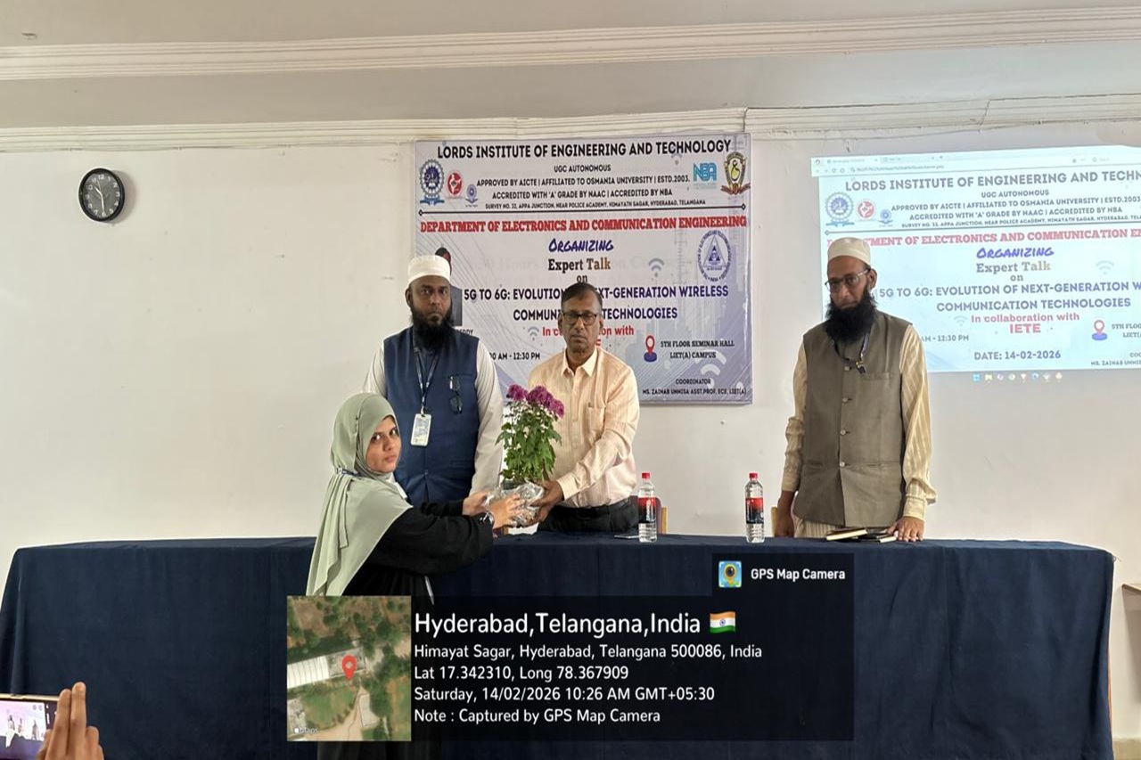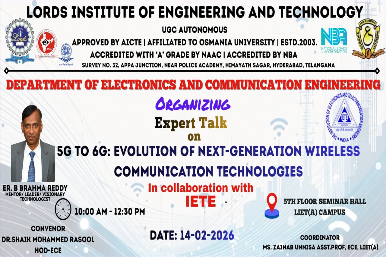 Description: The Department of Electronics and Communication Engineering, Lords Institute of Engineering and Technology (Autonomous), organized an Expert talk event, titled ‘ 5G to 6G: Evolution of Next-Generation Wireless Communication Technologies” on 14 February 2026 from 10:00 to 12:30 pm at the ECE seminar hall, LIET. The session was delivered by LION Er. B Brahma Reddy, Engineer/Mentor/Leader/Visionary/ Technologist, and focused on highlighted advancements in ultra-low latency, massive IoT integration, and intelligent network architectures. The speaker explained emerging challenges and opportunities in 6G research, inspiring participants to explore next-generation innovations. The talk was informative, engaging, and highly relevant to modern communication systems. Technology is evolving rapidly, and staying updated with next-generation communication systems is essential for our academic and professional growth. Today’s session will help us understand the present and future of wireless communication.