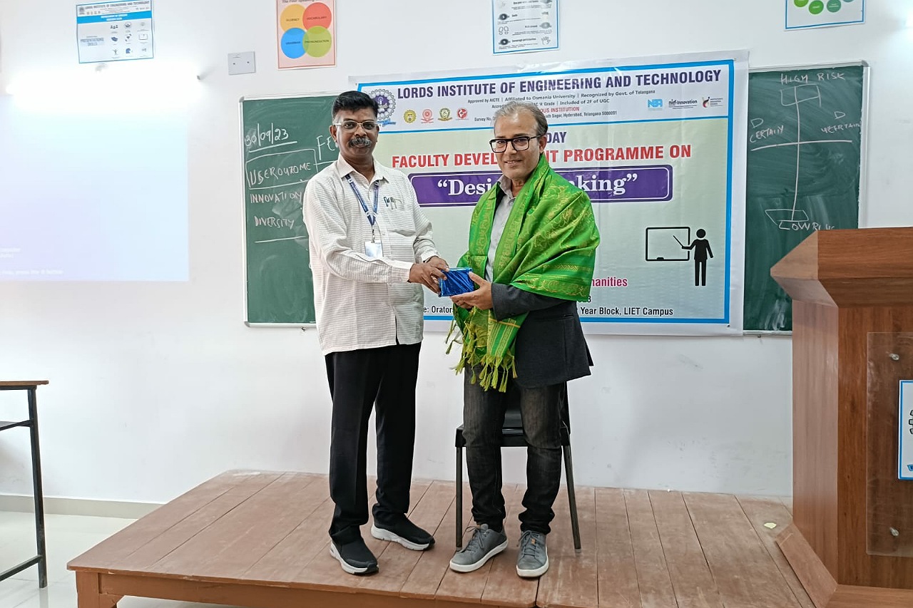 Description: The Science and Humanities department at Lords Institute of Engineering and Technology (A) organized a two-day Faculty Development Program on “Design Thinking ” on 30-09-2023 & 07-10-2023 at LIET Campus. The program aimed at enhancing teaching methodologies and fostering innovation in education. Mr Hasan Zubair served as the resource person. He discussed main topics and concepts during the program (e.g., design thinking principles, problem-solving, user-centered approach). The program spanned for two days and comprised a series of discussions, and hands-on activities. This Faculty Development Program on “Design Thinking ” was a valuable initiative that empowered faculty members with the tools and knowledge to enhance their teaching methods.