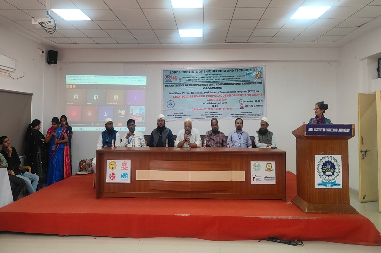 Description: The Department of Electronics and Communication Engineering, Lords Institute of Engineering and Technology (Autonomous), successfully organized a One-Week Virtual National-Level Faculty Development Program on Strategic Research Proposal Development and Grant Acquisition from 05 to 09 January 2026. The FDP witnessed active participation from over 225 faculty members and researchers representing more than 15 states across the country. The program focused on enhancing participants’ understanding of research ideation, proposal structuring, funding agency requirements, and grant acquisition strategies. The sessions were highly interactive and informative, enabling participants to strengthen their research capabilities. The FDP concluded with a valedictory session, marking the successful completion of the program.