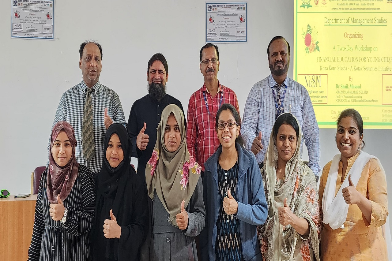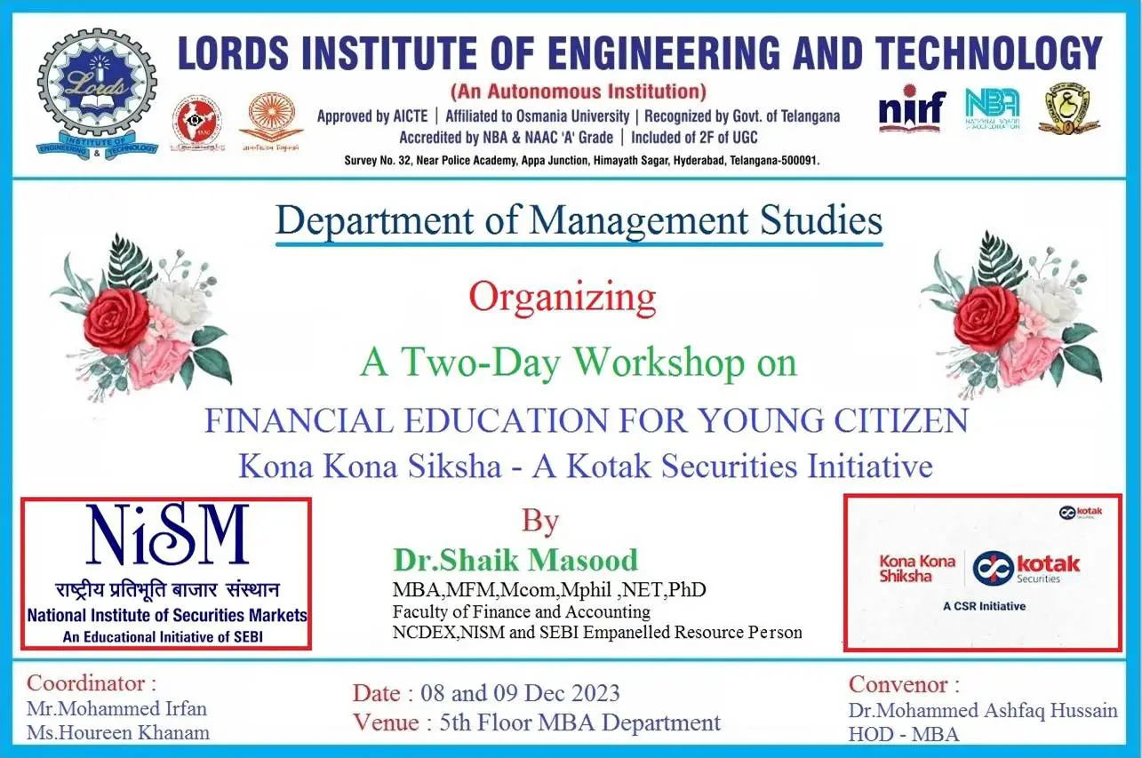 Lords Institute of Engineering and Technology , Department of Management Studies Organized a workshop on “Financial Education for Young Citizens” “Kona Kona Shiksha” a CSR initiative of Kotak Securities Ltd (KSL) for MBA I and II Year Students This was beneficial to the students as it provided valuable insights into the functions and role of the regulatory body on the investors, exchanges, industries etc. Dr. Shaik Masood was the Resource Person on behalf of the NISM as SEBI Empanelled Resource Person for Financial and Investment Planning. He also mentored on the various investment options in SEBI and the process of its methods of function in association with the norms of RBI. The securities and exchange board of India (SEBI) is the regulator for the securities market in India. It was established by the government of India on 12thApril 1992 and given statutory powers in 1992 with SEBI act 1992 being passed by Indian Parliament.