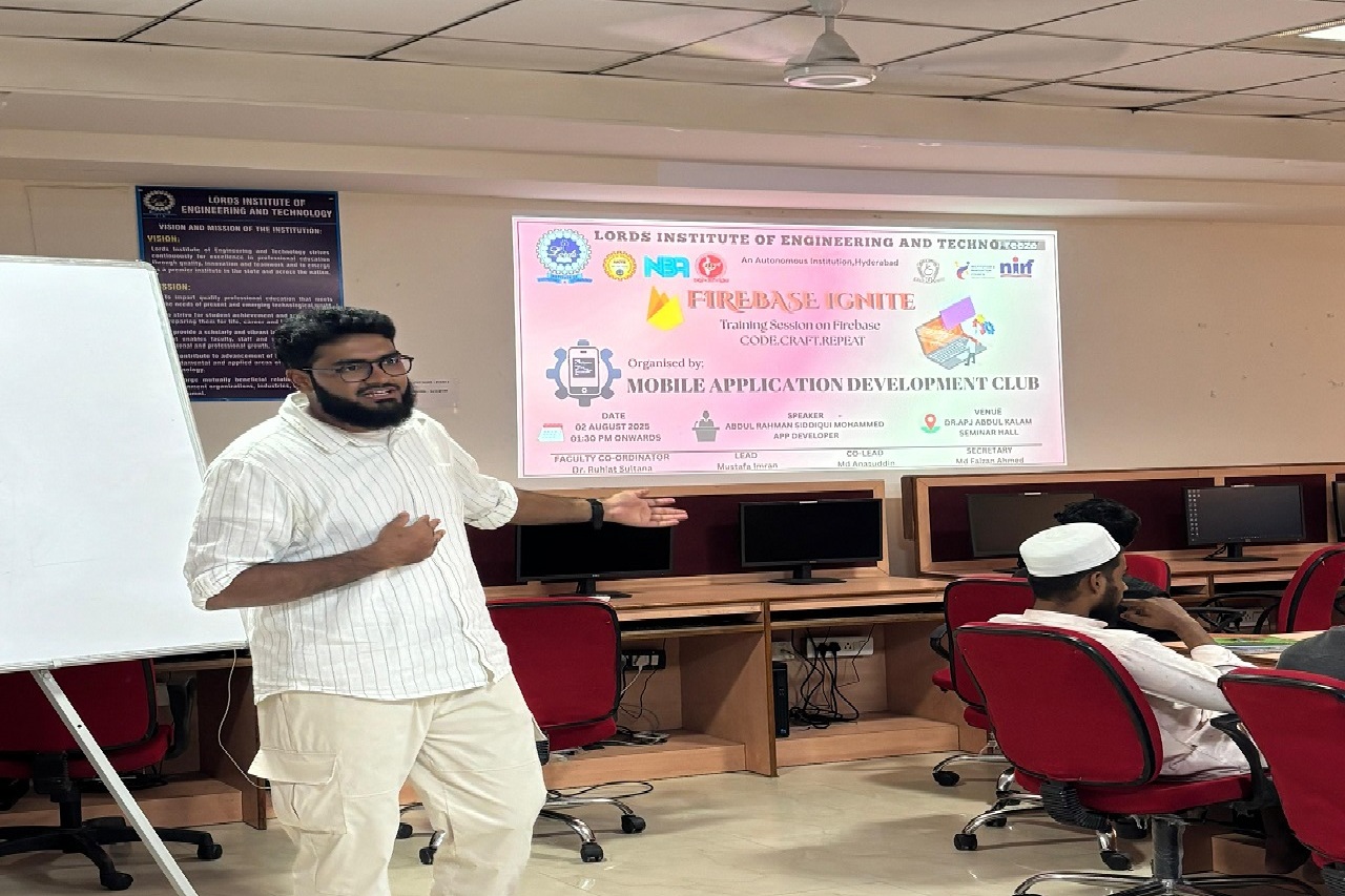 Description: The Mobile Application Development Club at Lords Institute of Engineering and Technology (A), organized a Training Session on Firebase Ignite on 2nd August 2025.The session focused on key aspects of modern app development, including backend integration, authentication, and real-time databases using Firebase. This event highlighted the growing importance of mobile app development in today’s digital ecosystem, where rapid deployment and real-time functionality are essential for innovation.