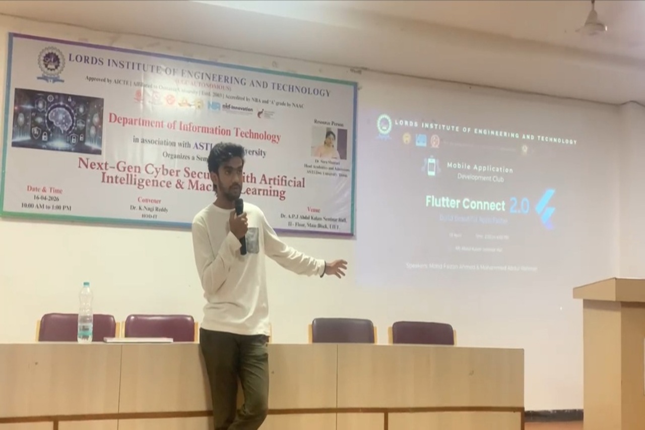 Description: The Mobile Application Development Club at Lords Institute of Engineering and Technology (A), on 18th April 2026 organized Awareness Session on Flutter. Session showcased how Flutter accelerates development using a single codebase for all platforms. Its Hot Reload feature enables instant code updates, while pre-built widgets ensure high-performance UI creation with minimal