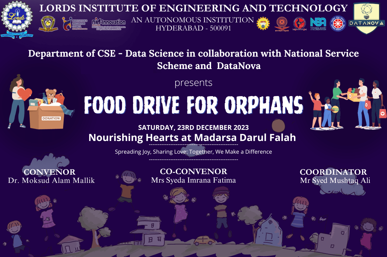 CSE-Data Science in association with NSS cell of Lords Institute of Engineering and Technology(A) orchestrated a remarkable food drive for orphan that touched countless lives on 23-12-2023. Their dedication and passion fueled a resounding success, echoing with heartwarming feedback. Together, they’ve woven a tapestry of hope and kindness, making a profound difference in our community