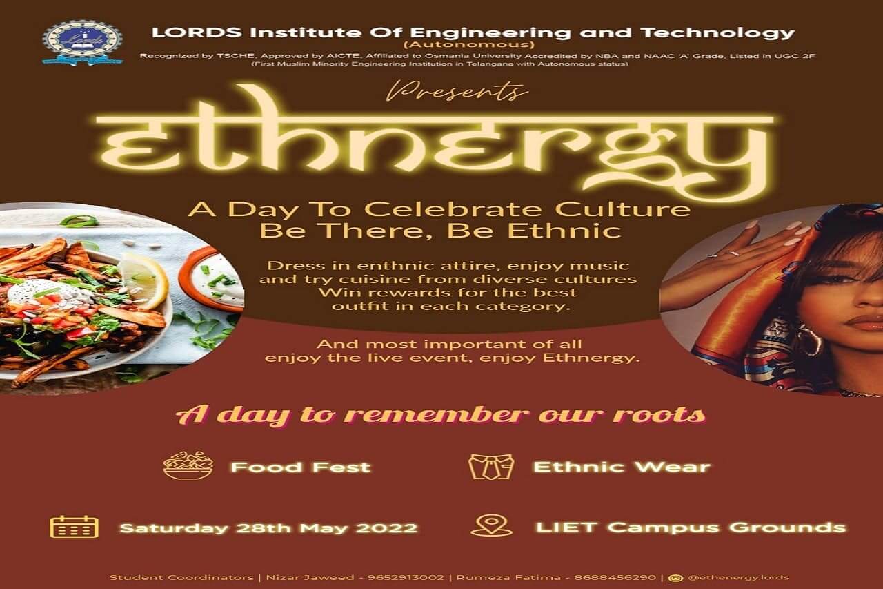 Ethnergy , a Food Fest and Ethnic Wear Day was conducted at Lords Institute of Engineering and Technology in Lords Cricket Grounds on 28-05-2022in order to promote cultural, unity in diversity by wearing various state dresses and various states food habits and tastes, to become entrepreneurs… in hotel industry with technology for interested students… The day started with faculty and students wearing different outfits and attires, with 45 stalls of different mouth watering dishes and foods were setup in the campus grounds .Many stalls were sponsored from outside.