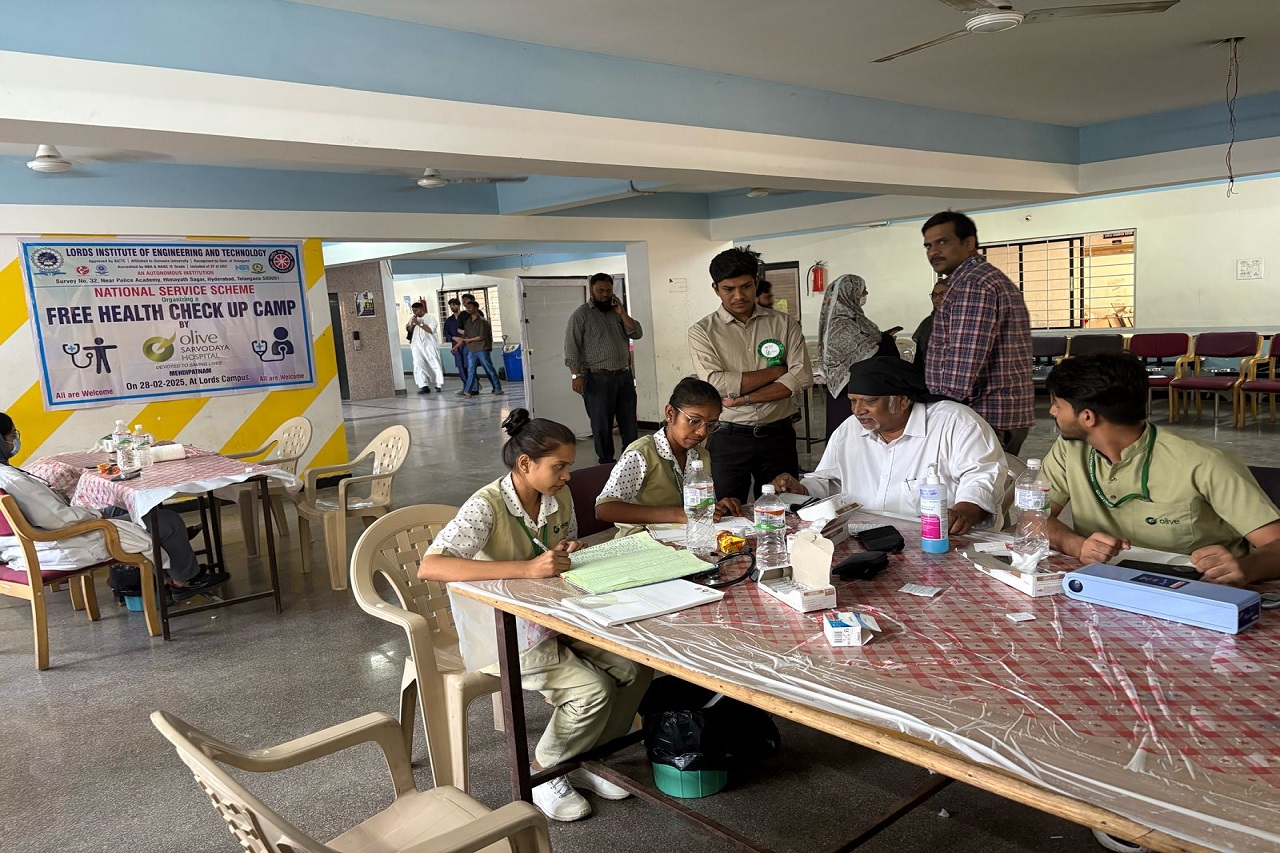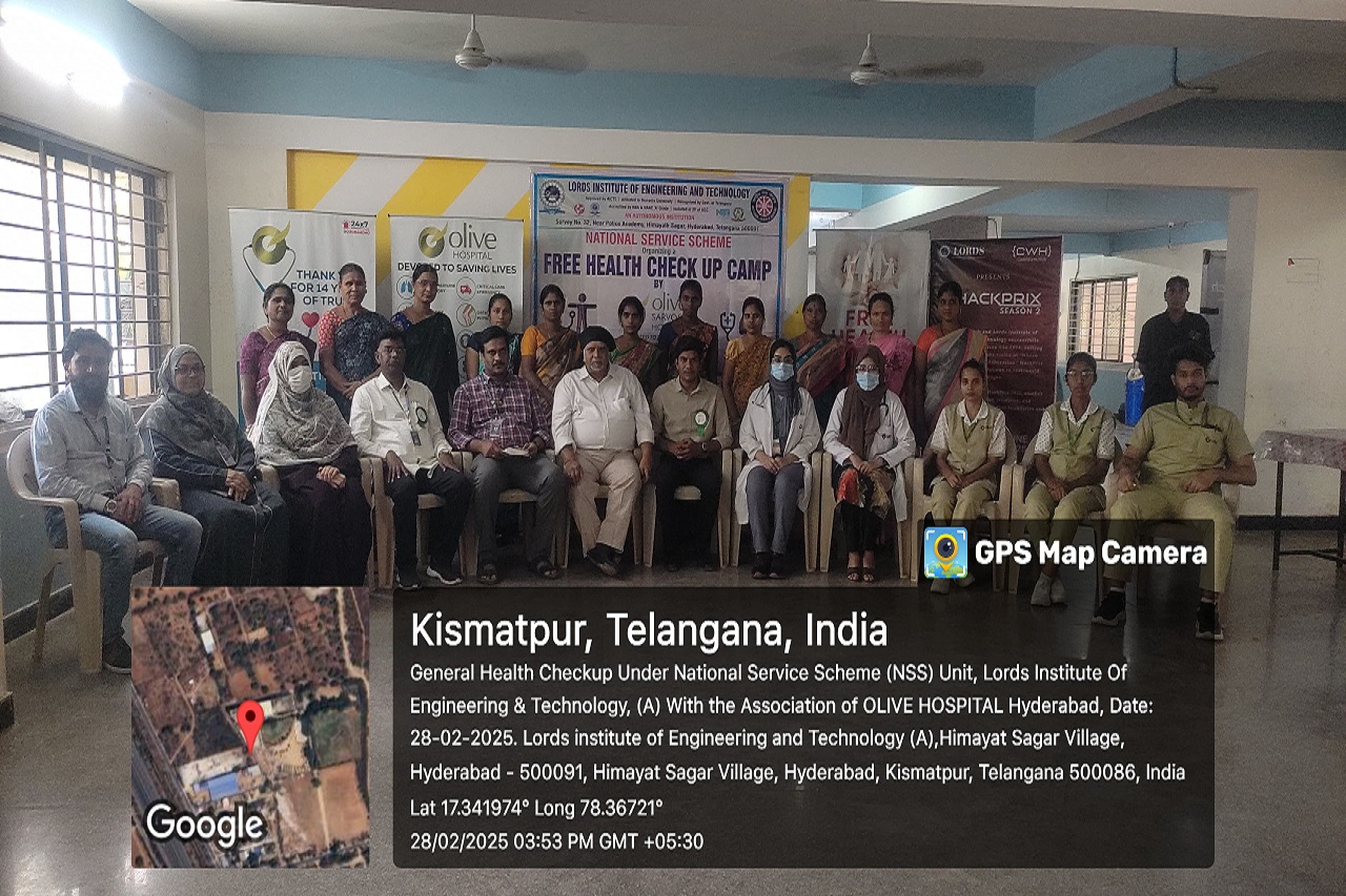 Description: The Lords Institute of Engineering and Technology, in collaboration with Olive Sarvodaya Hospital, successfully organized a Free Health Check-Up Camp under the National Service Scheme (NSS) on February 28, 2025, at the Lords Campus, Hyderabad.The camp aimed to promote health awareness and provide essential medical check-ups to students, faculty, and the local community.A team of expert doctors conducted general health screenings, blood pressure monitoring, diabetes tests, and consultations. With 300 participants, the event was a great success, ensuring better health awareness and preventive care. Attendees expressed gratitude for this initiative, which encouraged regular health check-ups.