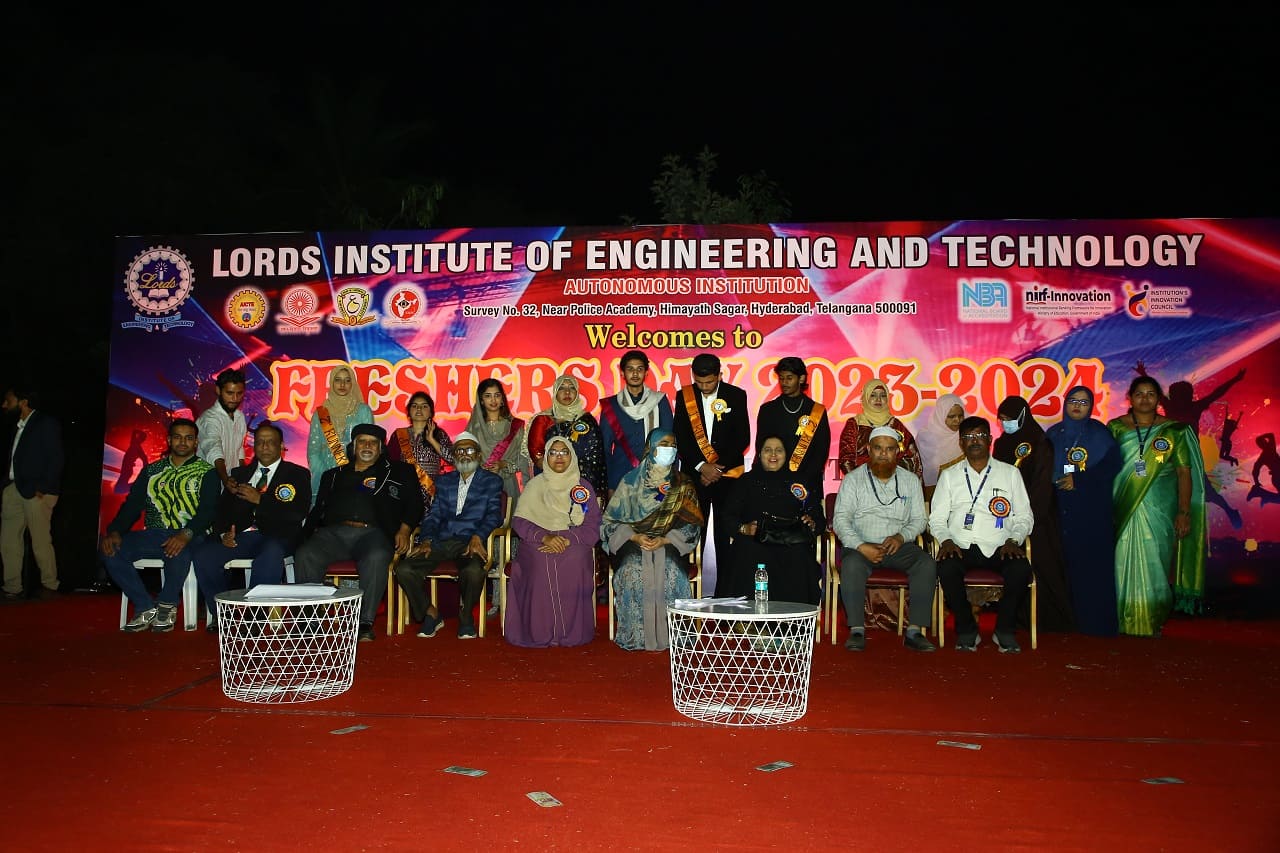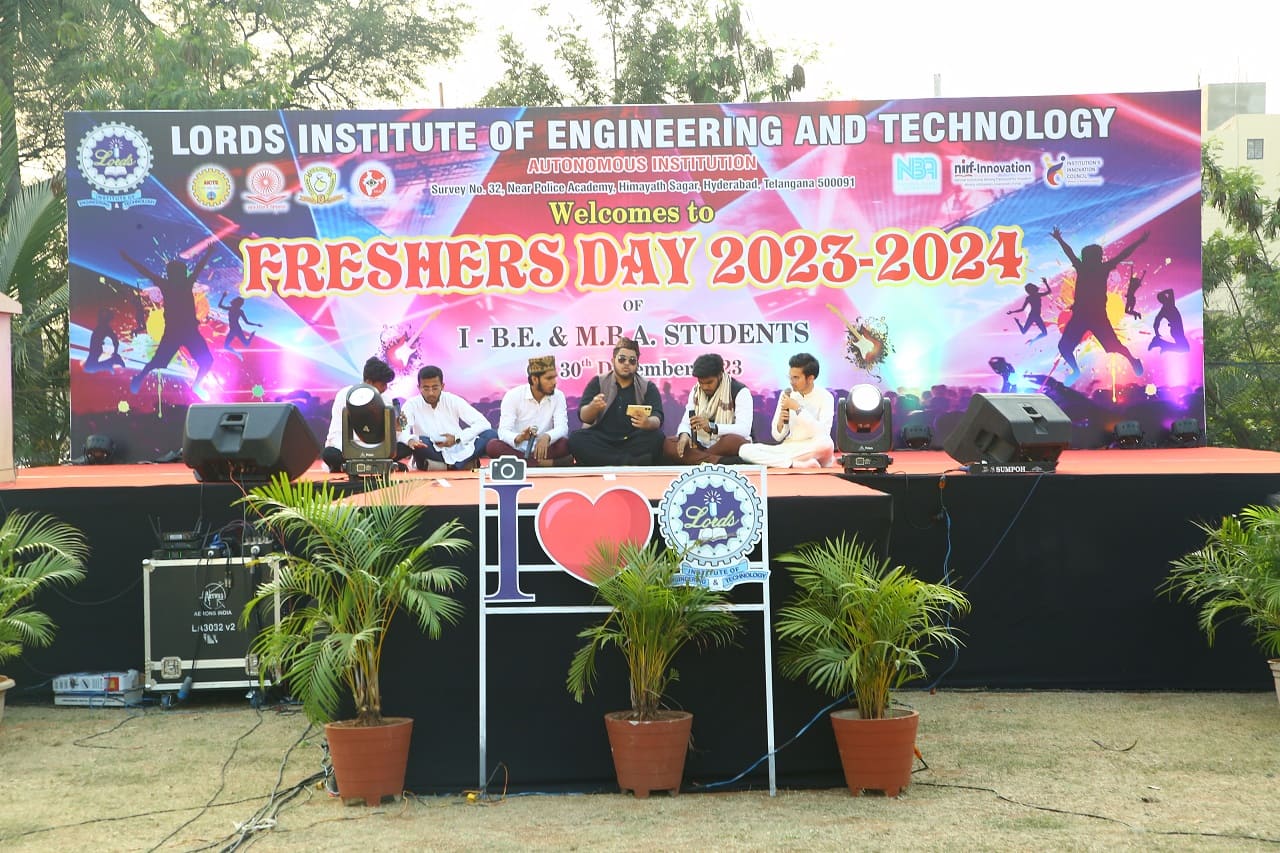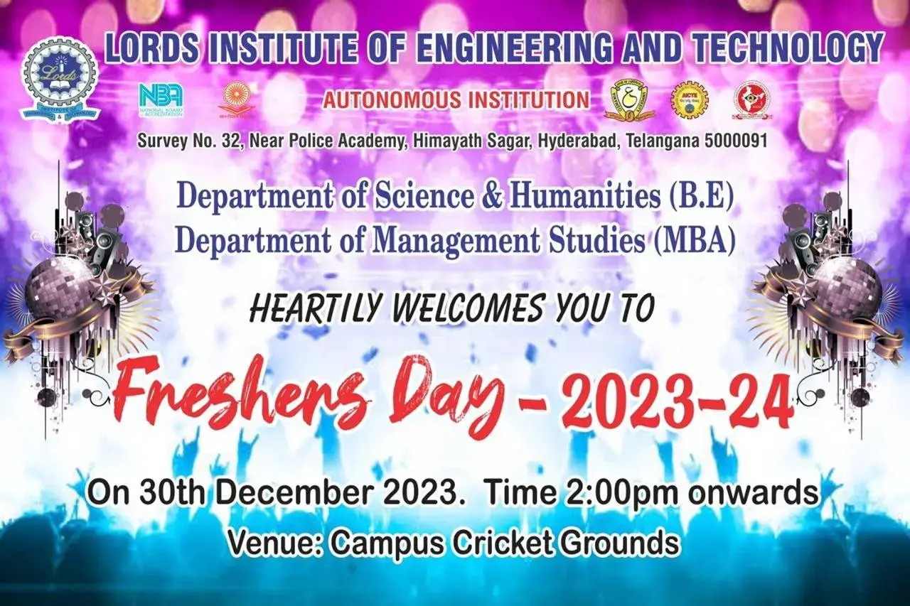 “Lords Institute of Engineering and Technology(A) joyously celebrated the Fresher’s Day for the B.E & MBA students of the 2023-24 batch on December 30, 2023, starting from 3:00 pm at the campus. The event was filled with vibrant cultural performances, including dance, singing, shayari, skits, and qawwali, showcasing the talent of both senior and junior students. A highlight of the day was the ramp walk, where the freshers confidently showcased their best outfits and accessories, leading to the selection of Mr & Ms Fresher. The event also featured the awarding of prizes for the winners and runner-up teams of the Youth Sports Fest 2023, recognizing achievements in both indoor and outdoor games. The program witnessed enthusiastic participation with over 1000 I-B.E & MBA students in attendance.”
