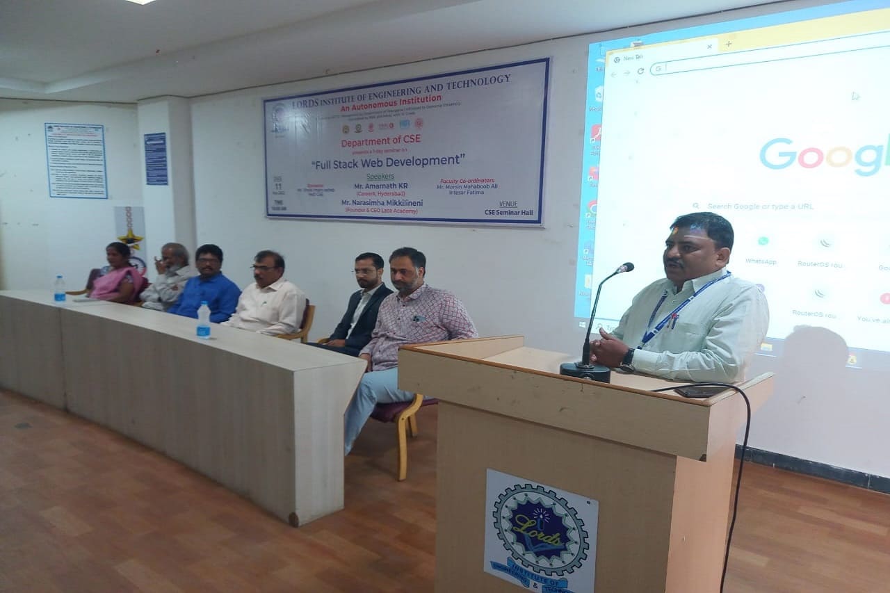 Description: A one-day seminar was conducted on “Full Stack Web Development” by the department of Computer Science and Engineering -Lords college of engineering and technology. This event was conducted at CSE Seminar Hall with over 150 students participating.