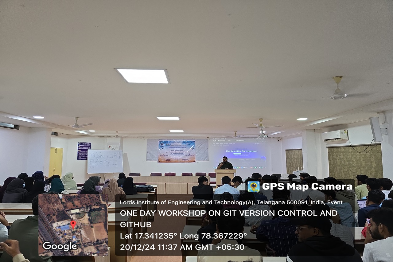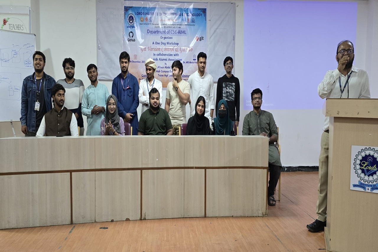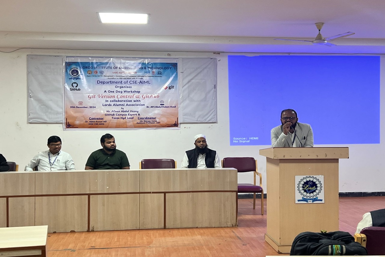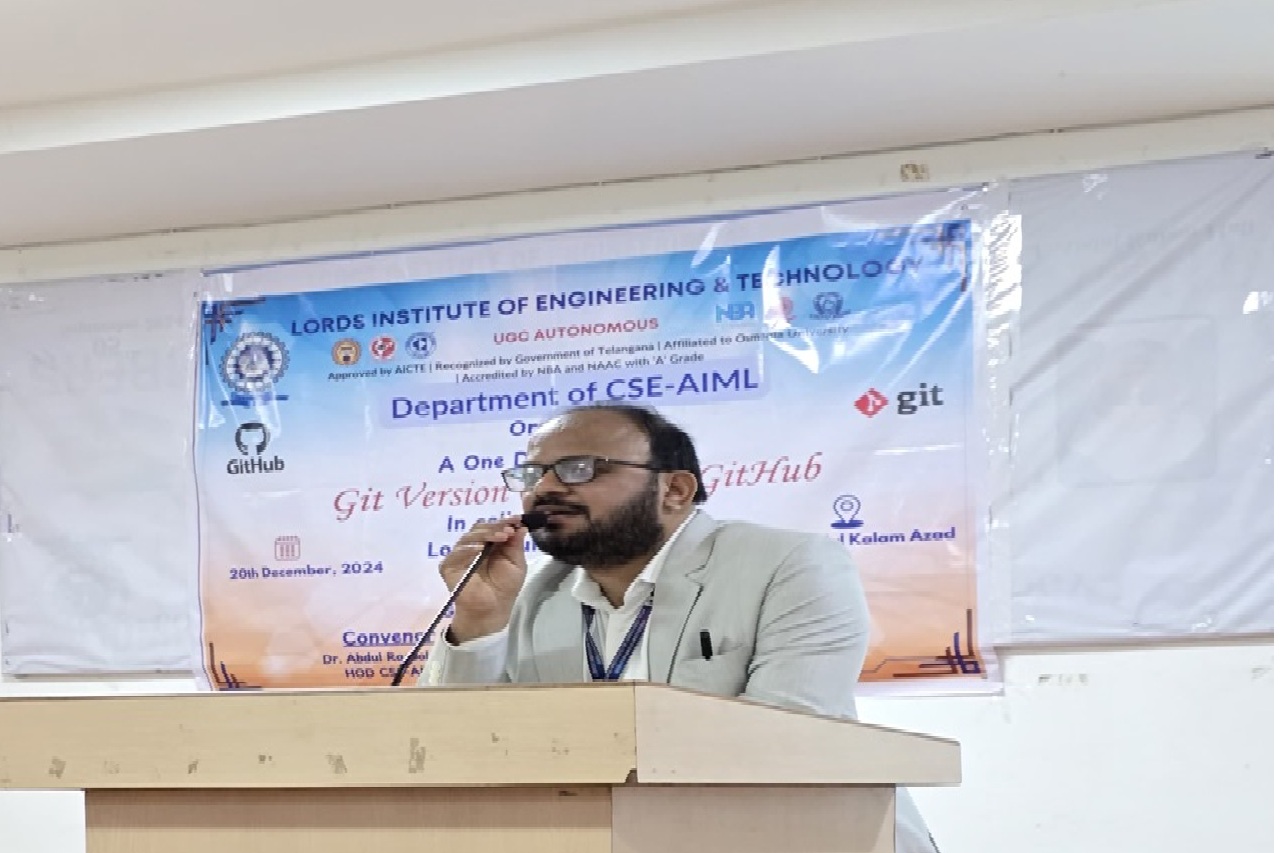 Description: The Department of CSE-AIML at Lords Institute of Engineering and Technology (A) organized a one day workshop titled “Git Version Control & Github” on December 20th , 2024, which was attended by 116 students and 8 faculty members. Such initiatives are vital as they equip participants with cutting-edge skills in Github, fostering innovation and enhancing communication in the digital era. Mr. Afnan Abdul Vasay Github Campus Expert & Tezos Hyd Lead., served as the resource person for the event.