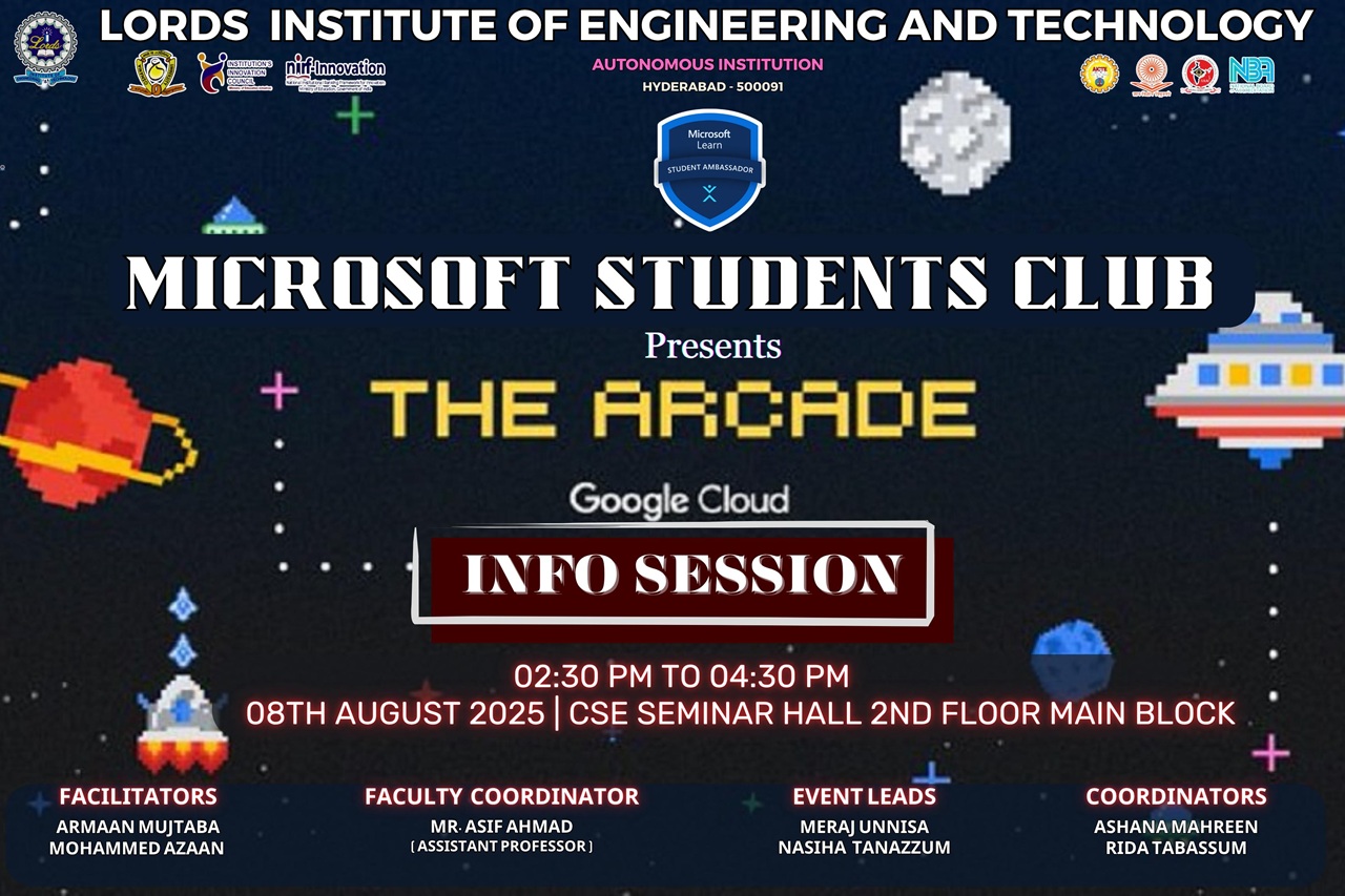 Description: THE ARCADE is an informative session organized by the Microsoft Students Club at Lords Institute of Engineering and Technology. The event focuses on guiding students through the Google Cloud Arcade program, sharing strategies to complete the program successfully, and highlighting the growing opportunities in Cloud-based technologies. It aims to inspire students to leverage cloud skills for academic and career growth.