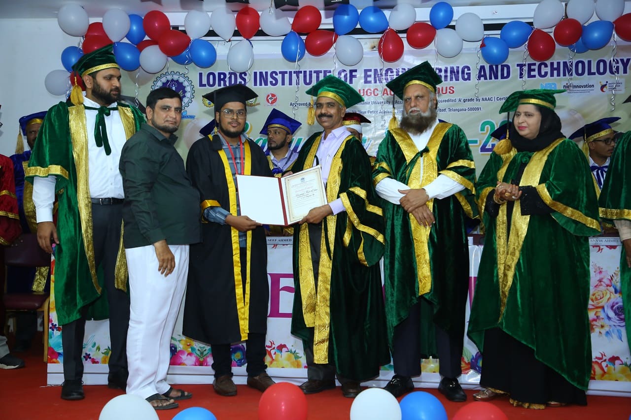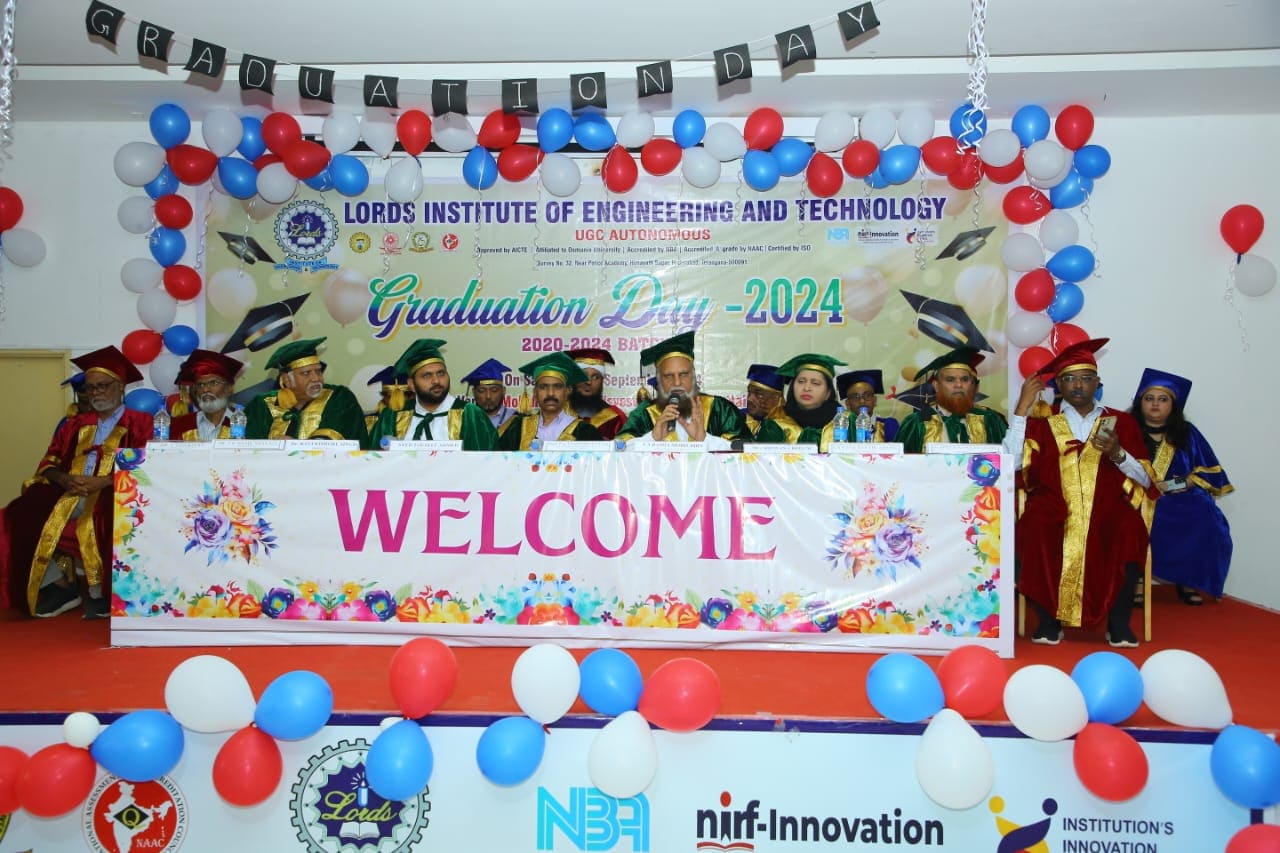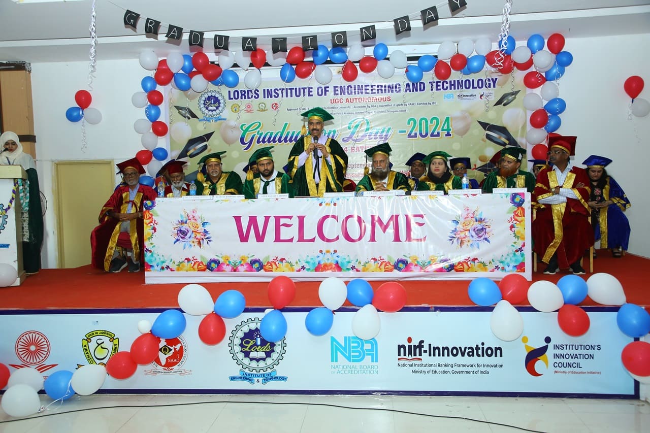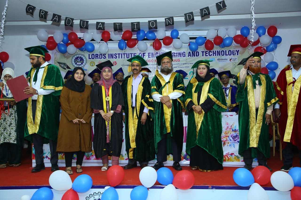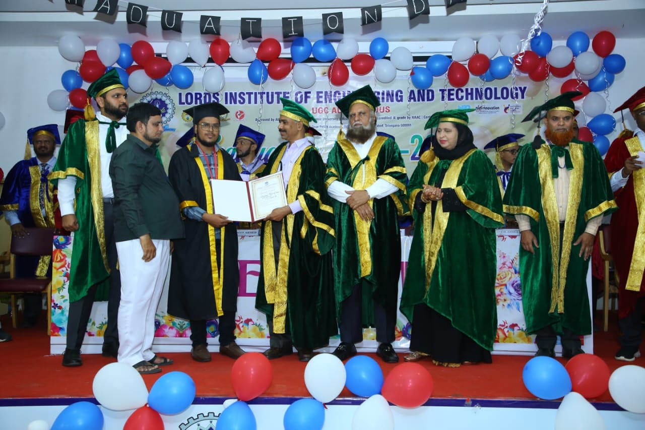 Description: Lords Institute of Engineering and Technology has organised “Graduation Day Ceremony” for the batch of 2020-2024 on Saturday, 14th September 2024 at 11.00 AM. The event was graced by the chief Guest Prof. P. Laxminarayana, Registrar, Osmania University, Hyderabad, Telangana and the Guest of Honour was Janab C. A. Basha Mohiuddin, Chairman, LIET along with the Secretary, Mrs Rizwana Begum; Vice-Chairman, Mr Syed Tousif Ahmed; Principal, Dr Ravi Kishore Singh, Deans, HODs and staff members. Osmania University 2nd Rank from CSE-Data Science,5th Rank from Mechanical Engineering,6th,7th and 8th Rank from CSE-AIML & Electrical Engineering branches were Awarded with Gold Medals whereas other students were awarded with silver medals and Graduation certificates. Prof. P. Laxminarayana, Registrar, Osmania University, Hyderabad anticipated that the students should be the leaders and not the followers. They should follow technology and utilise education and knowledge in their lives. He also emphasised that the technology in the form of AI & Chat GPT must be used worthfully and ethically. Janab C.A. Basha Mohiuddin motivated the students about their future life and how education can change the life of every individual, the speeches of secretary and Vice-chairman followed the journey of students in the 4 years of Engineering course. More than 400 graduated students along with their parents participated in the event. The event was live streamed on College YouTube channel to mark its grand success at international level.