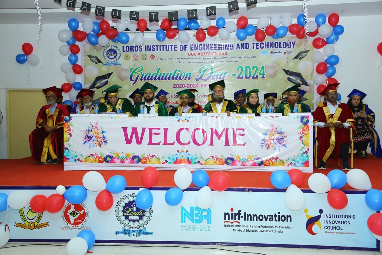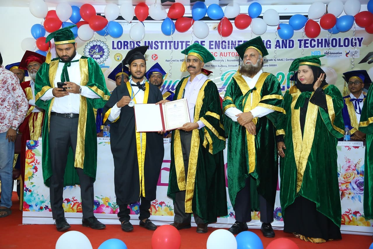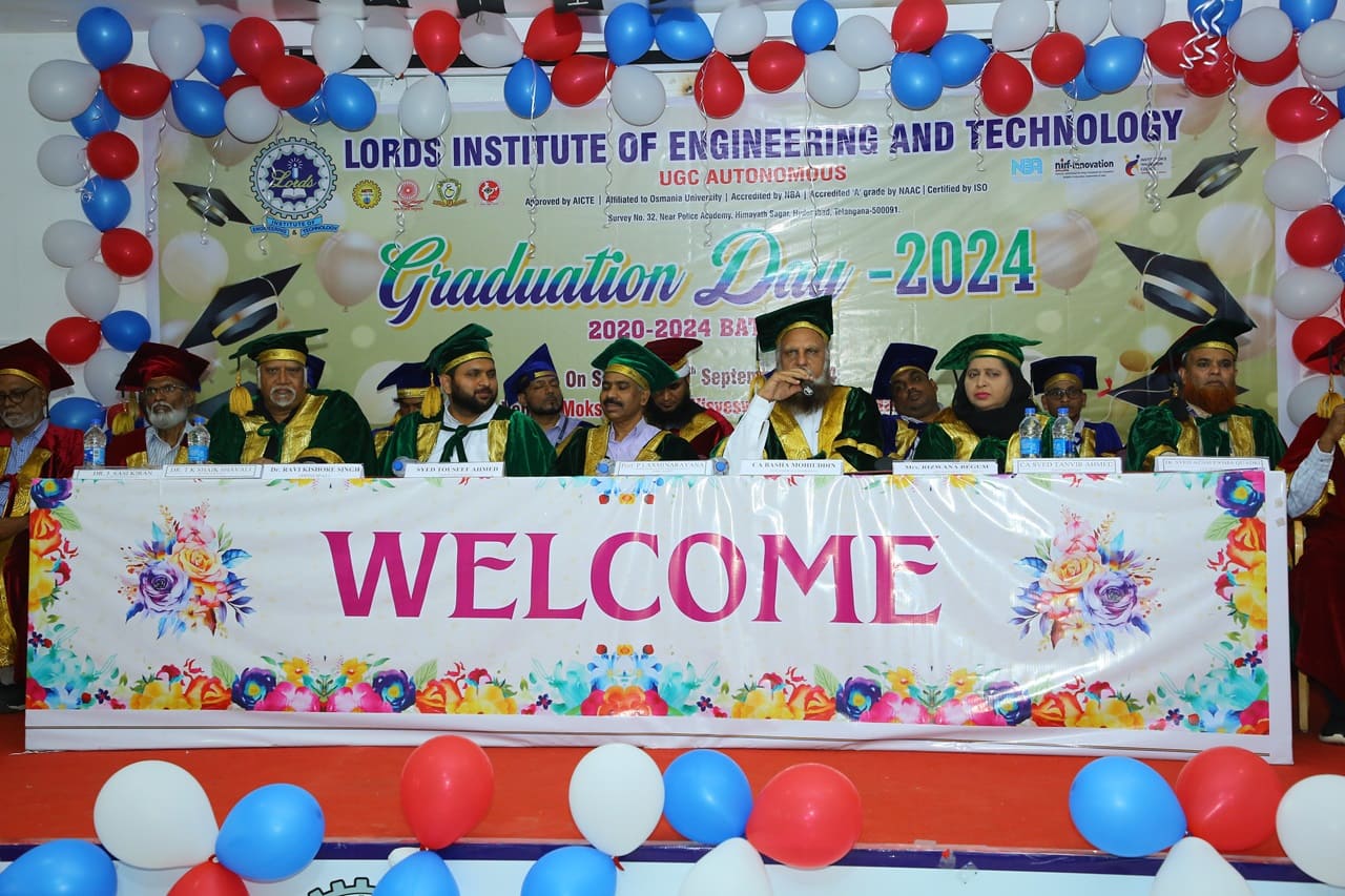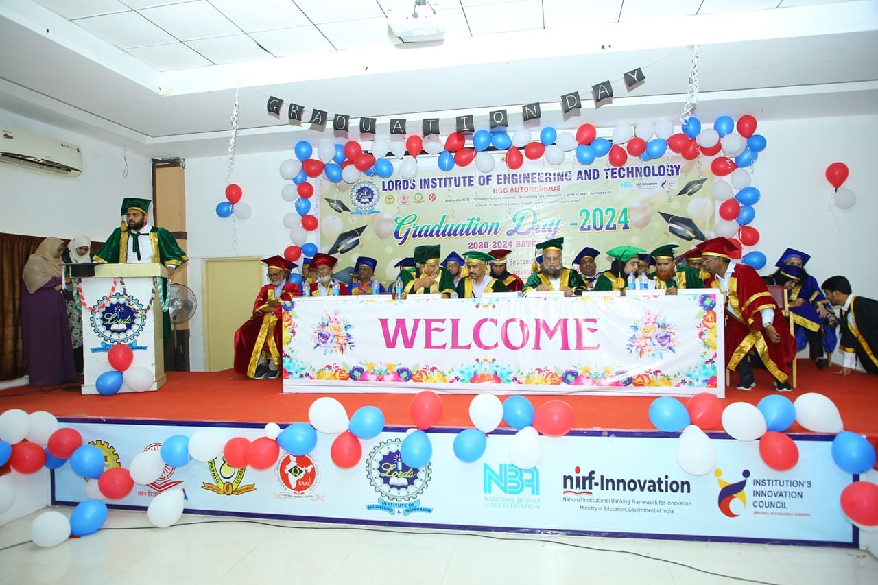 Description: Lords Institute of Engineering and Technology has organised “Graduation Day Ceremony” for the batch of 2020-2024 on Saturday, 14th September 2024 at 11.00 AM. The event was graced by the chief Guest Prof. P. Laxminarayana, Registrar, Osmania University, Hyderabad, Telangana and the Guest of Honour was Janab C. A. Basha Mohiuddin, Chairman, LIET along with the Secretary, Mrs Rizwana Begum; Vice-Chairman, Mr Syed Tousif Ahmed; Principal, Dr Ravi Kishore Singh, Deans, HODs and staff members. Osmania University 2nd Rank from CSE-Data Science,5th Rank from Mechanical Engineering,6th,7th and 8th Rank from CSE-AIML & Electrical Engineering branches were Awarded with Gold Medals whereas other students were awarded with silver medals and Graduation certificates. Prof. P. Laxminarayana, Registrar, Osmania University, Hyderabad anticipated that the students should be the leaders and not the followers. They should follow technology and utilise education and knowledge in their lives. He also emphasised that the technology in the form of AI & Chat GPT must be used worthfully and ethically. Janab C.A. Basha Mohiuddin motivated the students about their future life and how education can change the life of every individual, the speeches of secretary and Vice-chairman followed the journey of students in the 4 years of Engineering course. More than 400 graduated students along with their parents participated in the event. The event was live streamed on College YouTube channel to mark its grand success at international level.