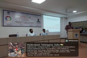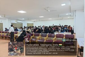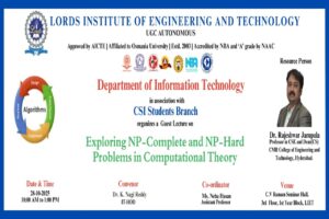 Resource Person: The Department of Information Technology, in association with the CSI Students Branch, organized a Guest Lecture on “Exploring NP-Complete and NP-Hard Problems in Computational Theory” on 28th October 2025 from 10:00 AM to 1:00 PM at Dr. APJ Abdul Kalam Seminar Hall, Lords Institute of Engineering and Technology (A). The session was delivered by Dr. J. Rajeshwar, Professor in the Department of CSE and Dean (CS) at CMR College of Engineering and Technology, Hyderabad. The lecture provided valuable insights into computational complexity, helping students deepen their understanding of NP-Complete and NP-Hard problems. A total of 114 students actively participated in the session, making it an engaging and informative event.