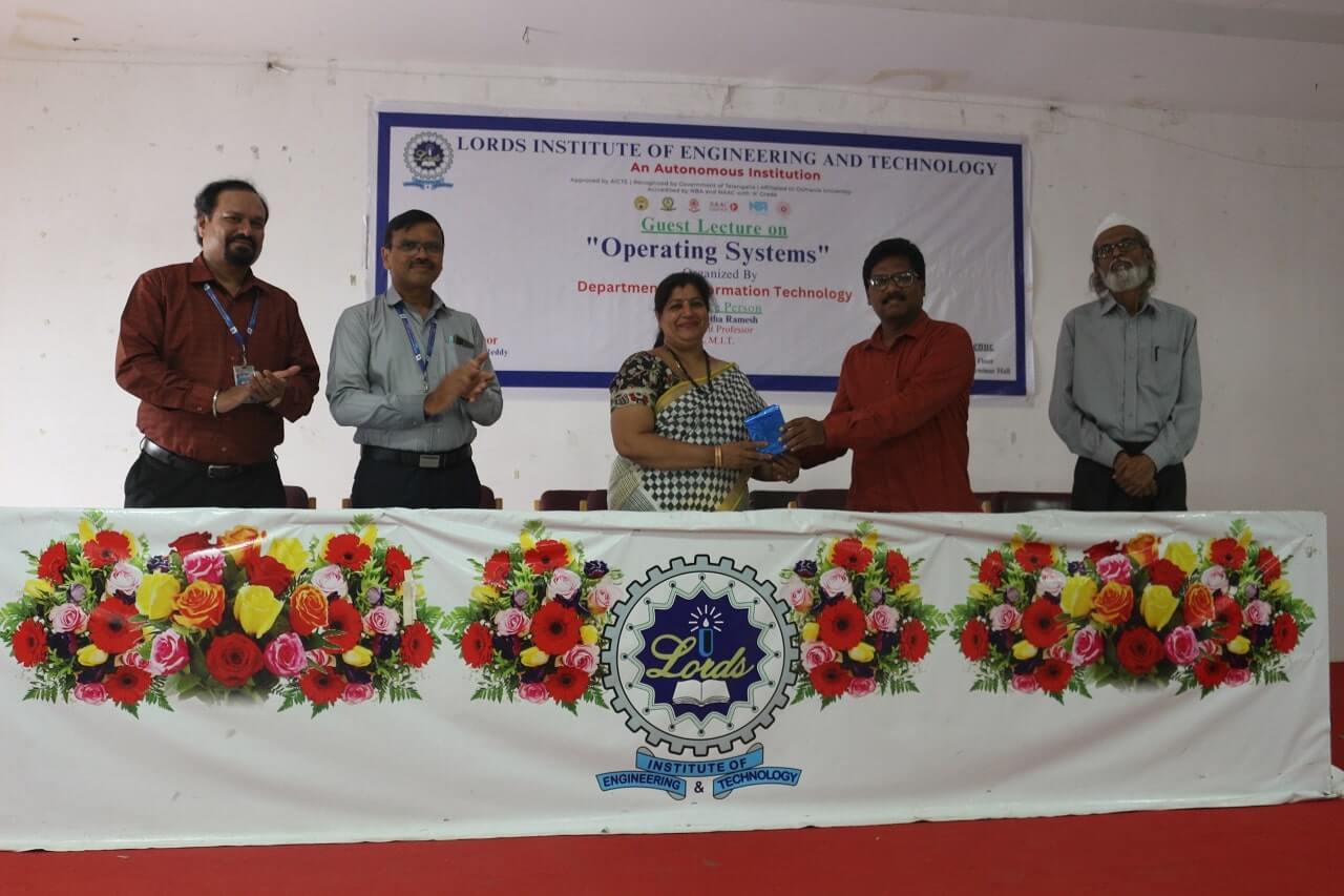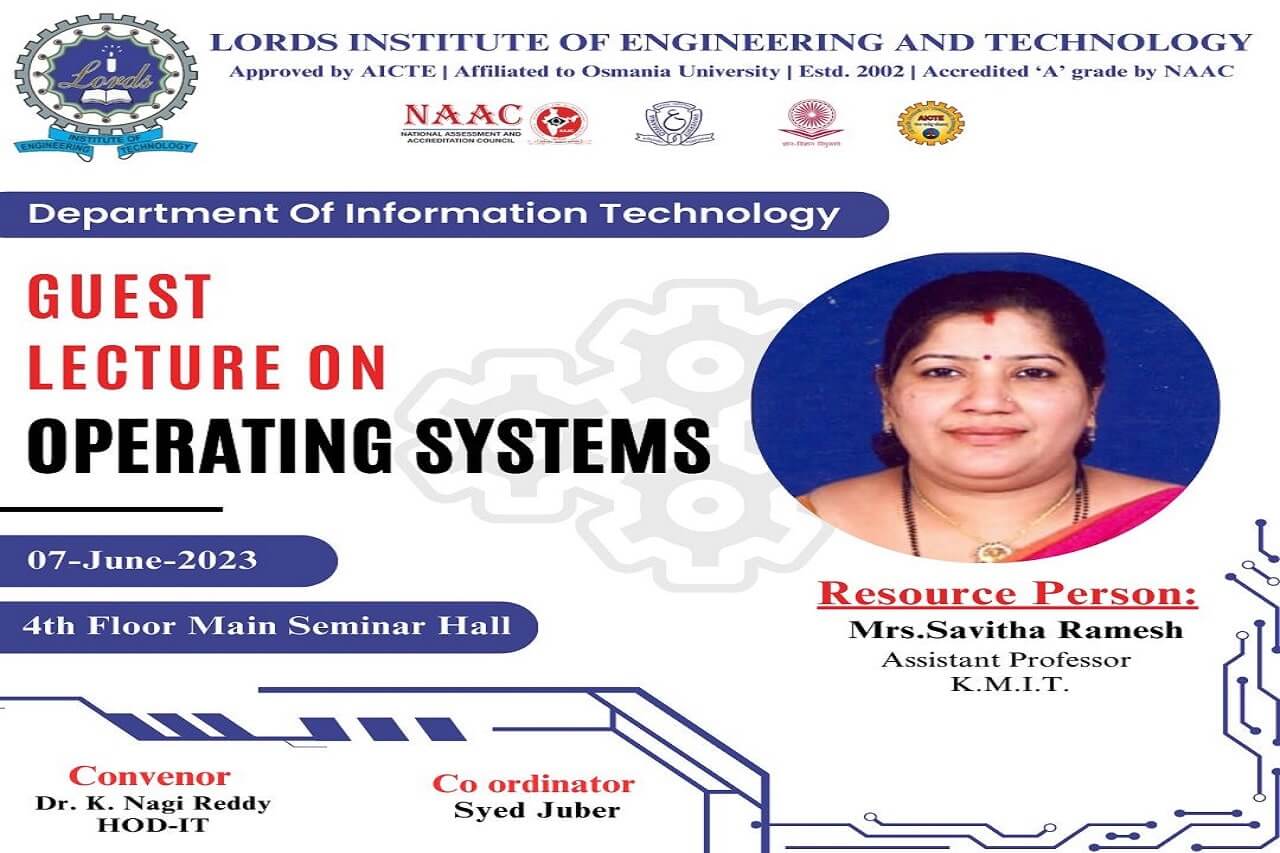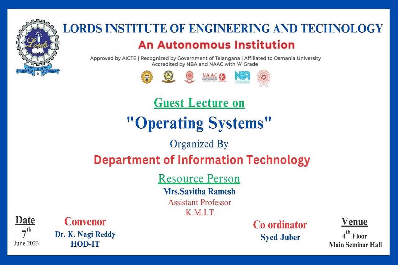 Description: A Guest Lecture on Operating Systems was organized by the Department of Information Technology on 7th June 2023 at Lords Institute of Engineering and Technology, Hyderabad. On total 127 students have participated for the event. The main objective of the Guest Lecture was to provide the importance of Operating System in their academics as well as for placements. The convener of the event Dr. K.Nagi Reddy, HoD-IT welcomed all the participants , resource person and Directors & Deans of LIET who have showered their wishes to the participants towards their successful career.