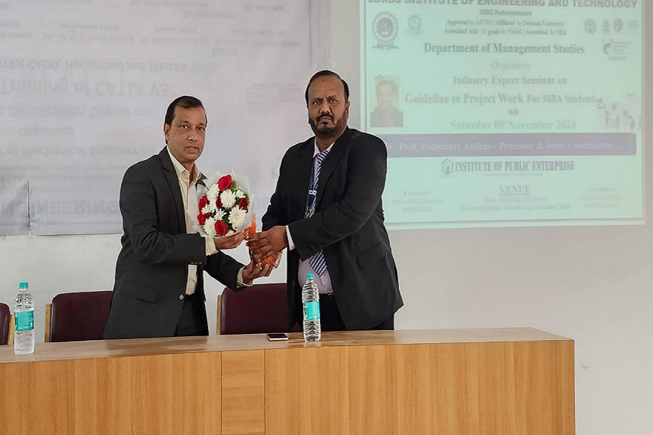 Description about the event (50 Words): A Industry Expert Seminar on “Guidelines on Project Work” was arranged by department of Management Studies on 09/11/24 at Lords Institute of Engineering & Technology, Hyderabad. A total of 87 students have participated in the event. The objective of this seminar was to provide knowledge on project work which will be useful for their academics and placements. The resource person was Dr. Padmaker Jadhav, Professor, IPE, Hyderabad. The convenor of the event Dr.Mohammed Ashfaq Hussain, HOD MBA welcomed all the participants, resource person, Principal ,Deans & Directors of LIET who have participated towards this successful event.