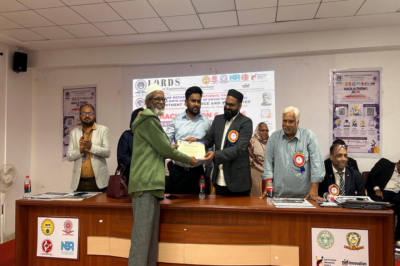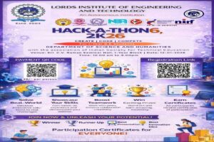 Description: The Department of Science and Humanities, Lords Institute of Engineering and Technology, successfully conducted HACK-A-THON 6 (2K26) on 12 January 2026 at Sri C. V. Raman Seminar Hall. The event was graced by the presence of the Chief Guest, Mr. Shaik Sadeq Ali, Deputy Director, MS Education Academy, who motivated students with his insightful address. More than 200 students participated enthusiastically, showcasing innovation, coding skills, and teamwork. The hackathon provided a vibrant platform for first-year B.E students to solve real-world problems collaboratively. Winners were recognized in various categories, and participation certificates were distributed to all students, making the event highly successful and impactful.