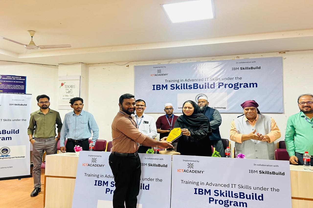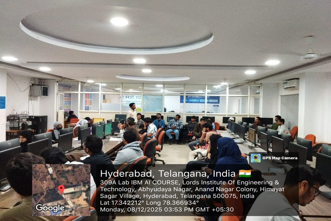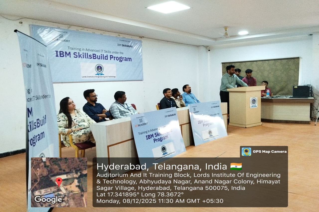 Description: Lords Institute of Engineering and Technology (A), a member institution of ICT Academy, successfully inaugurated a Training Program in Advanced IT Skills under the ICT–IBM SkillsBuild Program for IV Year students, conducted from 08/12/2025 to 11/12/2025. The training program was organized in two batches—Artificial Intelligence (Batch I) and Data Analytics (Batch II)—with 65 students participating in each batch. Each course comprised a total of 42 hours, including 16 hours of self-learning, 24 hours of instructor-led sessions, and 2 hours of assessment. The initiative is designed to enhance students’ understanding of emerging technologies and equip them with practical, industry-relevant skills, thereby significantly improving their employability in the IT sector.