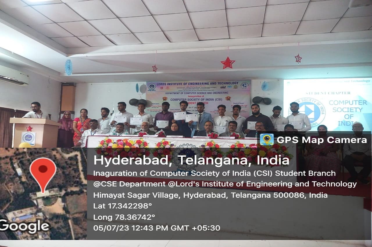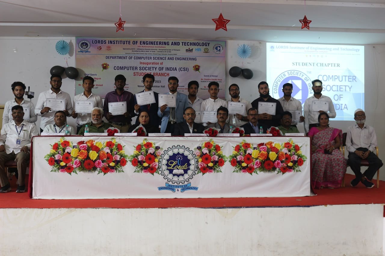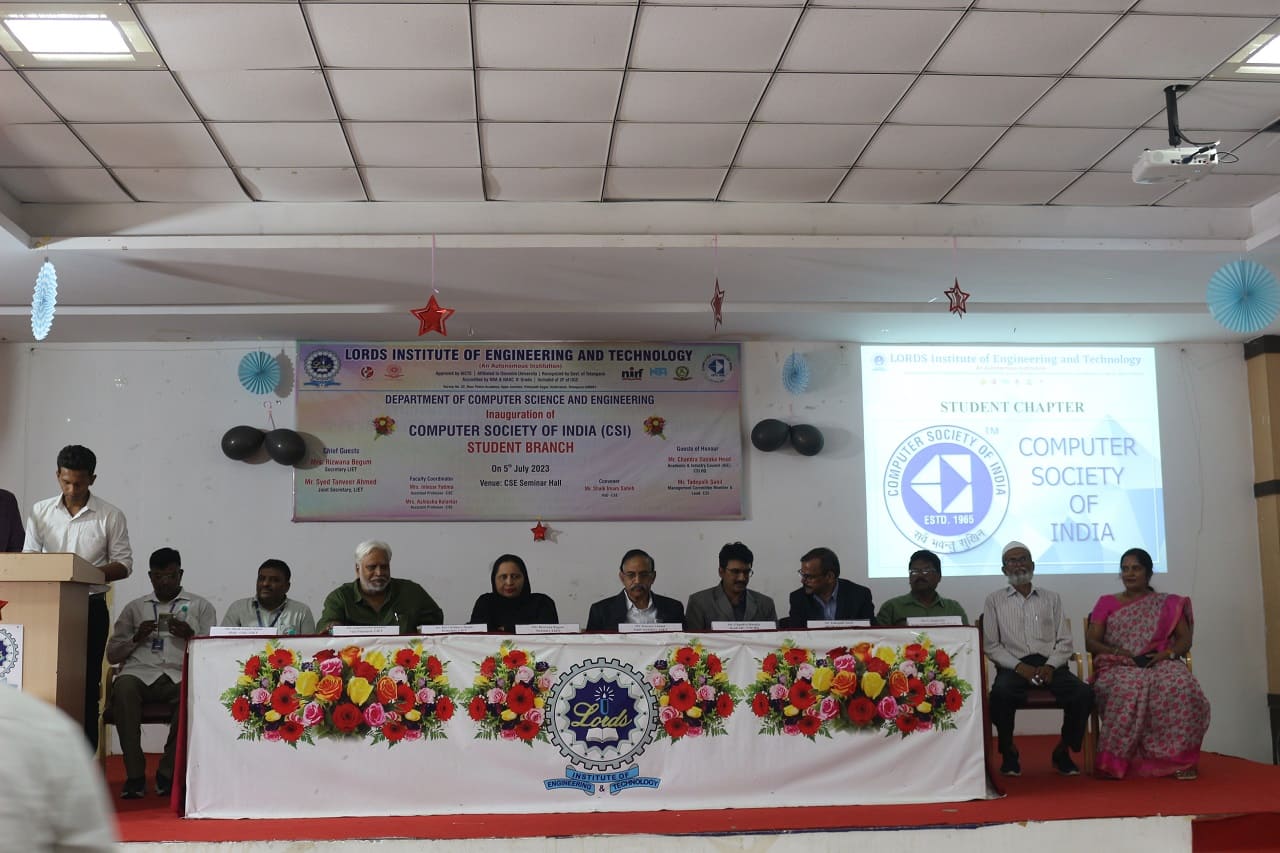 The Department of Computer science and Engineering, Lords Institute of Engineering and Technology, an Autonomous institution, Hyderabad has successfully inaugurated the Computer Society of India (CSI) Student Branch on 5th July 2023 with deity.The Guest of honour Mr. Chandra Dasaka – Head, Academic and Industry council, CSI. Secretary, CSI inaugurated the student branch of LIET. The chief guest Mrs. Rizwana Begum, Secretary, LIET advised students to make full use of activities and events under CSI, to improve the skills of the students which in turn gives confidence in participating in competitions and recruitment drives. Dr. R.K.Singh, Principal addressed the gathering and wished students a great success and asked them to come out with innovative ideas so as to meet industry standards.Dr Shaik Shavali, Professor and Dean Student affairs and Mr. Shaik Imam Saheb, HoD-CSE , CSI Student Branch Counsellor,narrated the efforts taken to inaugurate the student branch and elaborated the functions of governing body members. All the HoDs , Deans of LIET and faculty were present at the venue.Mr. Hanzala Shaikh , President student branch, introduced the student members who have been elected as executive student committee.The guests of honour Mr. Chandra Dasaka – Head, Academic and Industry council, CSI. Secretary, CSI. Mr. Tadepalli Sunil – Chapter Student Branches Lead for Telangana & AP. G. Srinivasu – Management Committee member of CSI, inspired the students with their speeches and explained the roles and benefits of CSI student branch. Speakers gave satisfactory answers to the students queries. At the end of the program snacks was given away to all the participants.Approximately 300 students participated in the inaugural function.