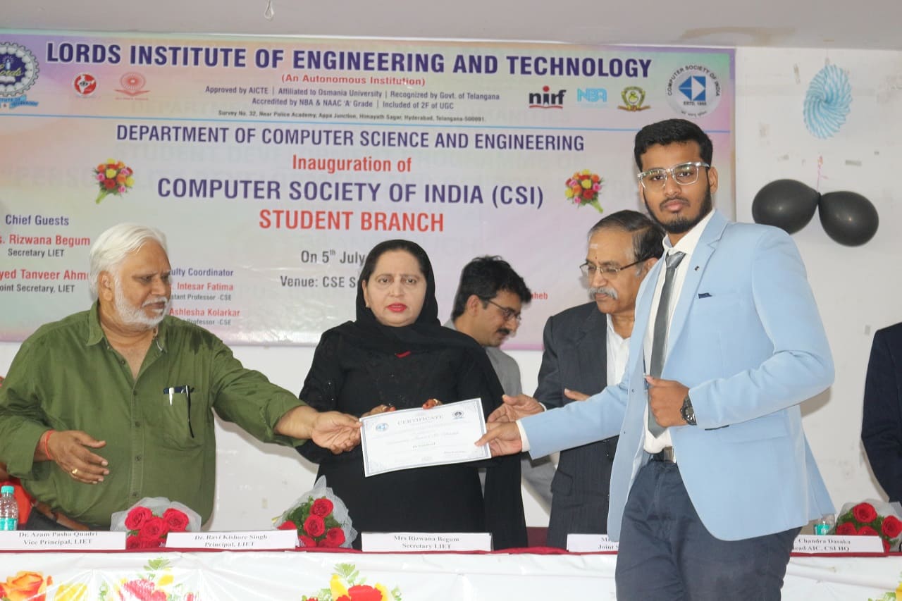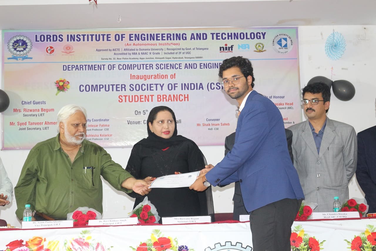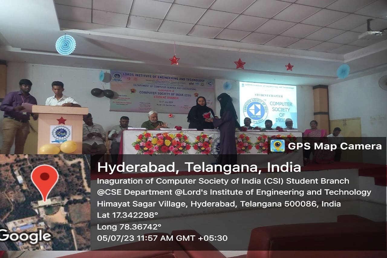 The Department of Computer science and Engineering, Lords Institute of Engineering and Technology, an Autonomous institution, Hyderabad has successfully inaugurated the Computer Society of India (CSI) Student Branch on 5th July 2023 with deity.The Guest of honour Mr. Chandra Dasaka – Head, Academic and Industry council, CSI. Secretary, CSI inaugurated the student branch of LIET. The chief guest Mrs. Rizwana Begum, Secretary, LIET advised students to make full use of activities and events under CSI, to improve the skills of the students which in turn gives confidence in participating in competitions and recruitment drives. Dr. R.K.Singh, Principal addressed the gathering and wished students a great success and asked them to come out with innovative ideas so as to meet industry standards.Dr Shaik Shavali, Professor and Dean Student affairs and Mr. Shaik Imam Saheb, HoD-CSE , CSI Student Branch Counsellor,narrated the efforts taken to inaugurate the student branch and elaborated the functions of governing body members. All the HoDs , Deans of LIET and faculty were present at the venue.Mr. Hanzala Shaikh , President student branch, introduced the student members who have been elected as executive student committee.The guests of honour Mr. Chandra Dasaka – Head, Academic and Industry council, CSI. Secretary, CSI. Mr. Tadepalli Sunil – Chapter Student Branches Lead for Telangana & AP. G. Srinivasu – Management Committee member of CSI, inspired the students with their speeches and explained the roles and benefits of CSI student branch. Speakers gave satisfactory answers to the students queries. At the end of the program snacks was given away to all the participants.Approximately 300 students participated in the inaugural function.