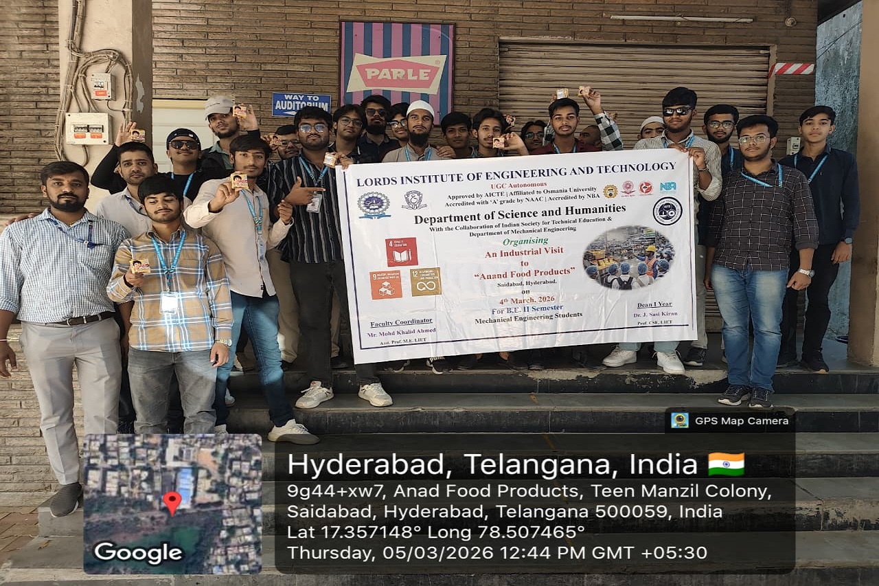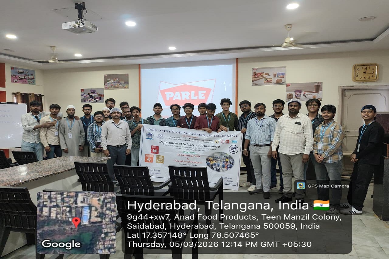 Description: The Department of Science and Humanities and Department of Mechanical Engineering, organized an Industrial Visit to Anand Food Products, Saidabad, Hyderabad on 05-03-2026. The visit provided students with valuable insights into food product manufacturing technology and various automation processes used in the industry. During the visit, students gained practical exposure to food manufacturing processes and automation principles. Overall, the industrial visit helped in bridging the gap between theoretical knowledge and real-time industrial practices in the food manufacturing sector.