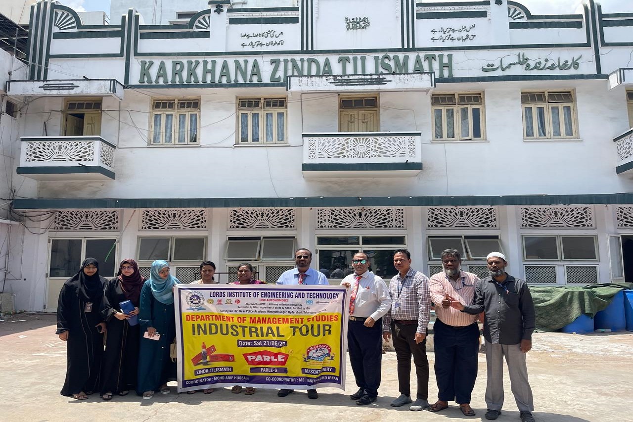 Description: The visit to the Zinda Tilismath factory that manufactures Unani herbal medicine invented in 1920 by Hakim Mohammed Moizuddin Farooqui in Hyderabad. It is a liquid remedy known for treating various ailments like colds, coughs, and stomach issues, and is based on the Unani system of medicine. This industry trip gave MBA students and faculties of LIET, practical exposure to business operations. We observed the production process, quality checks, and management systems in action. This experience helped us relate our classroom knowledge to actual industry practices. Interacting with professionals also provided useful insights into modern trends and workplace expectations. All the participants were overwhelmed with the visit and urged for more such industry visits during the course to gain more real time knowledge and take this as case studies.