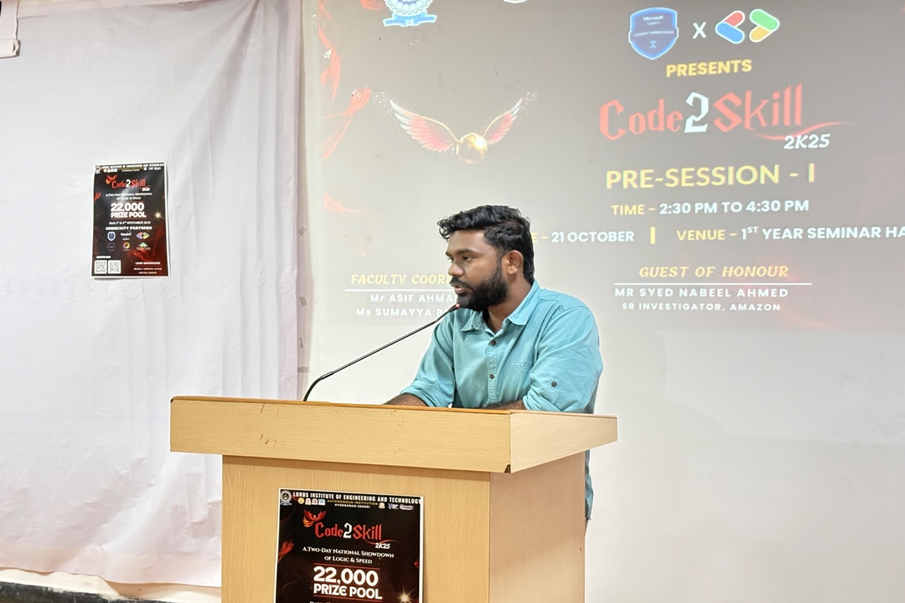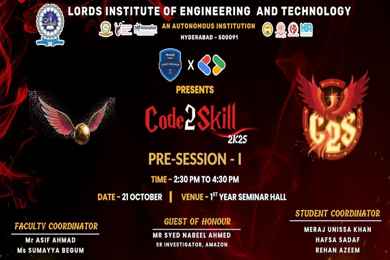 Description: Code 2 Skill is a competitive programming competition organized by the Microsoft Students Club at Lords Institute of Engineering and Technology. The event aims to guide students through the world of competitive programming, sharing effective strategies to excel in coding challenges and highlighting the growing opportunities in the tech industry.