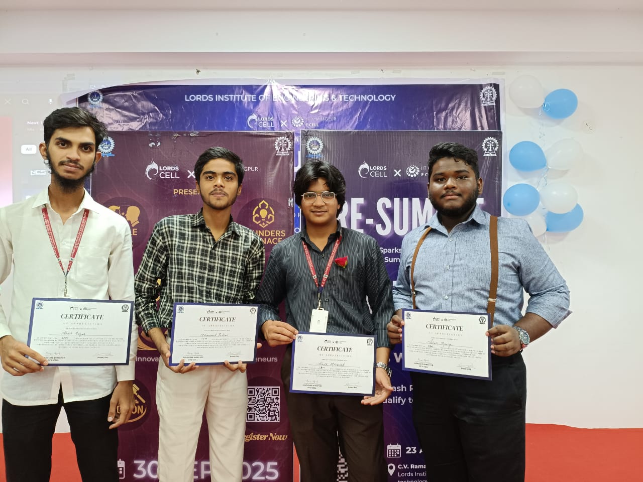 - Congratulations to Mr. Mohammed Firdous, Mr. Shaik Faizan, Mr. Shaik Maviya, and Mr. Shaik Mahmood of IT-II-B for securing the 3rd Prize in the Pre-Summit IDEATHON organized by the L.I.E.T E-Cell in collaboration with the IIT Kharagpur E-Cell at the National Level on 23rd August 2025. – View