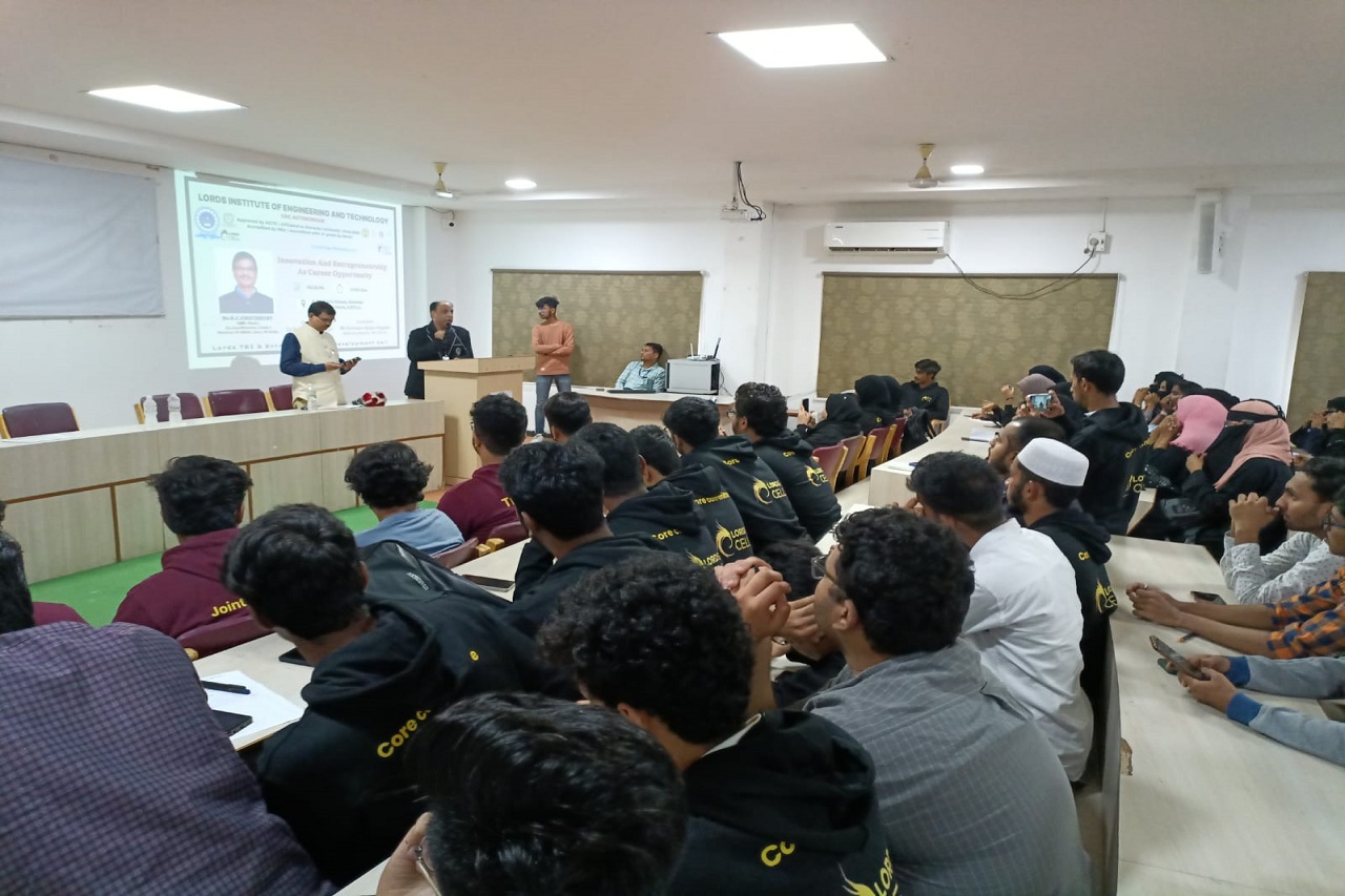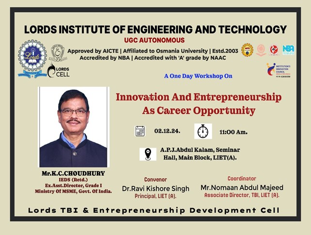 Description: The program started at 11 am with a welcome address to the audience by Dr.Sumet Hangargi, IIC Coordinator. LIET(A). The resource person Mr.K.C.CHOUDHURY, Ex. Asst Director, Grade I, MSME, Govt. of India. was introduced by Mr. Nomaan Abdul Majeed, Associate Director, TBI, LIET(A).