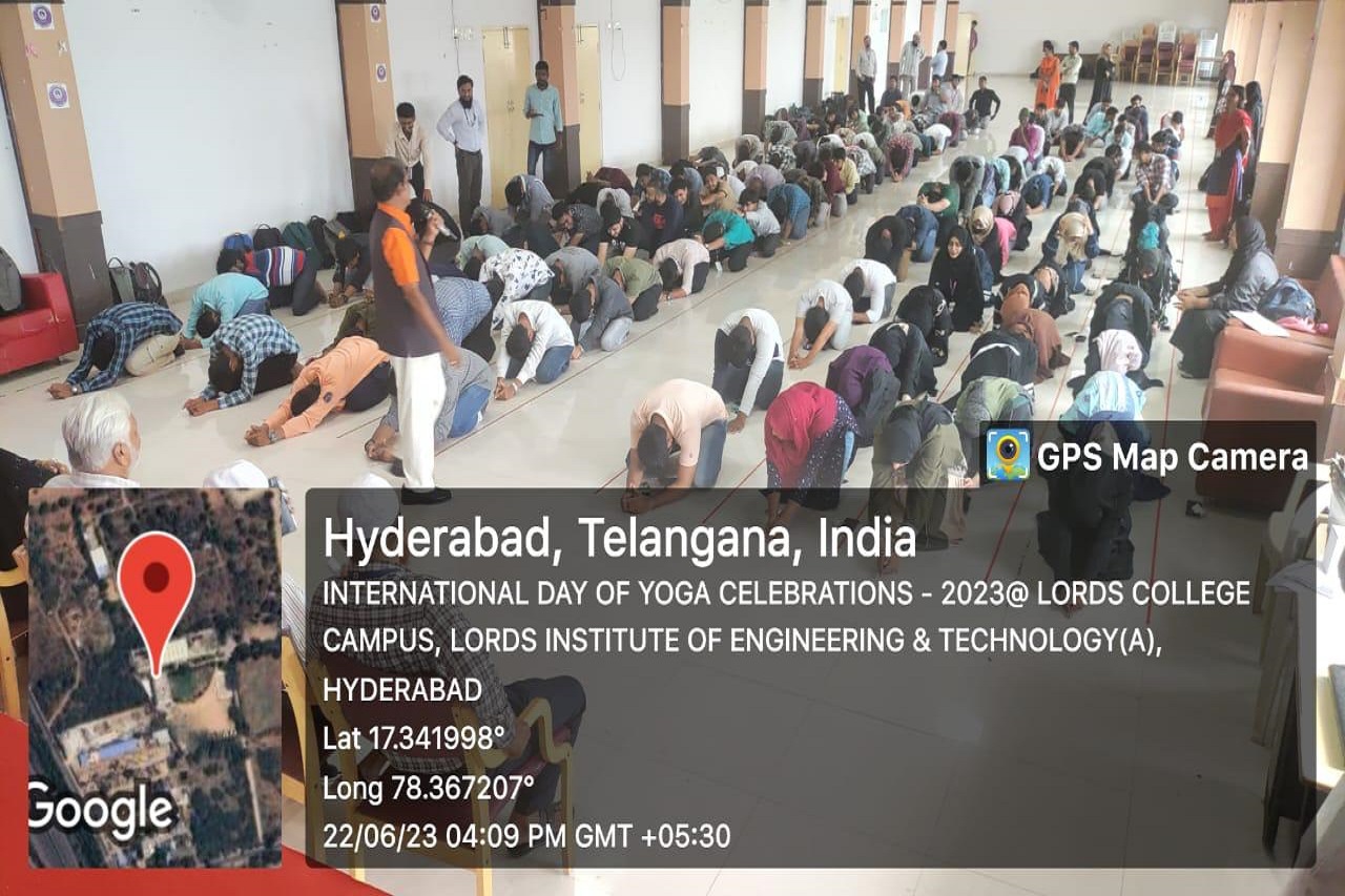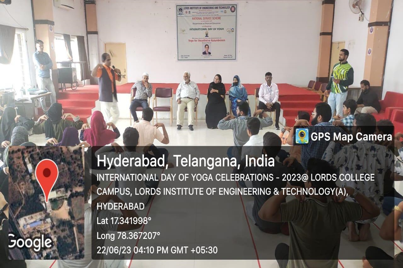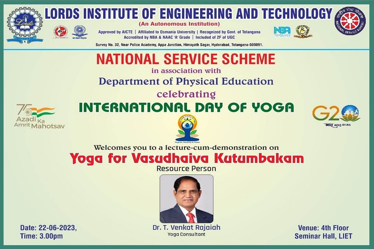 Description: Lords Institute of Engineering and Technology under NSS wing has conducted “International Day of Yoga Celebrations” on 22nd June, 2023 at LIET Campus. The main theme of this event is to promote and raise awareness about the benefits of practicing yoga. It aims to highlight the holistic approach of yoga in achieving physical, mental, and spiritual well-being. The theme focuses on encouraging students to incorporate yoga into their daily lives and experience its transformative effects.