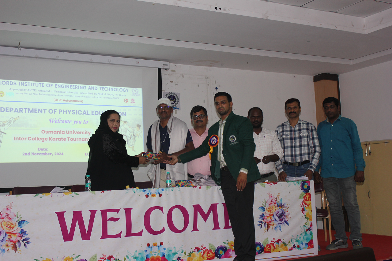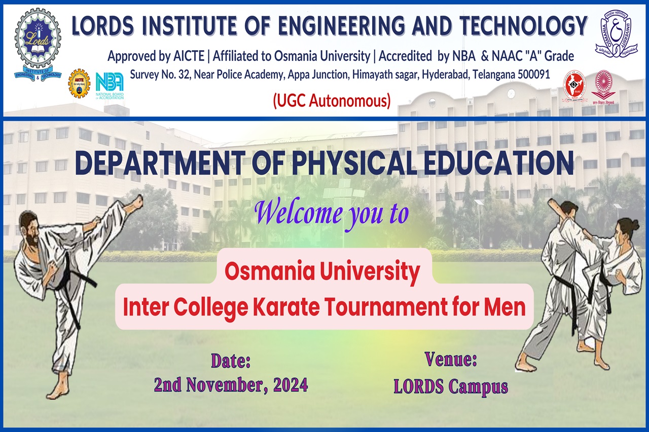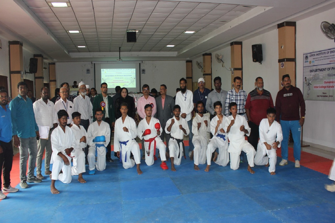Description: Lords Institute of Engineering Technology (A) hosted the Osmania University Inter-College Karate Tournament on its campus on November 2, 2024, with 40 colleges participating. The event, which also served as the OU team selection trial, saw Lords Institute secure the overall championship title, earning two gold medals and one silver. Mohammed Huzaifa Sharif, a second-year ECE student, won gold in both the -84 kg and KATA individual categories, while Ismail Fazal claimed silver in the +84 kg category. Both athletes are selected to represent OU in the South Zone Inter-University Tournament at LNCIT University, Bhopal, from November 16 to 20, 2024.The event was graced by Chief Guest Prof. K. Deepla, IUT Secretary of the Department of Physical Education at Osmania University, and Guest of Honour Prof. Rajesh Kumar, ICT Secretary of the Department of Physical Education and Dean of Student Affairs. The tournament was observed by Mr. Aditya Reddy, appointed by OU.