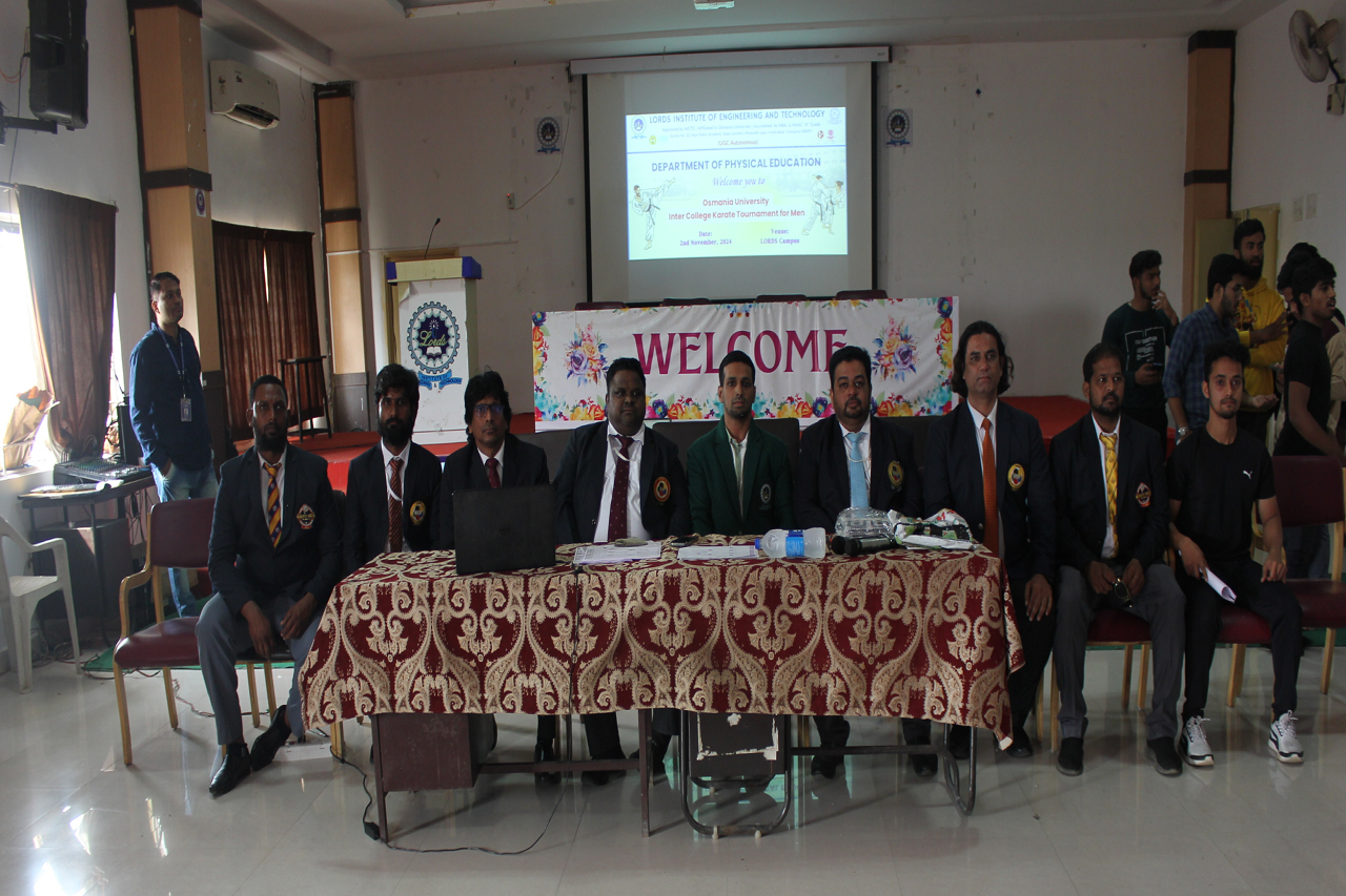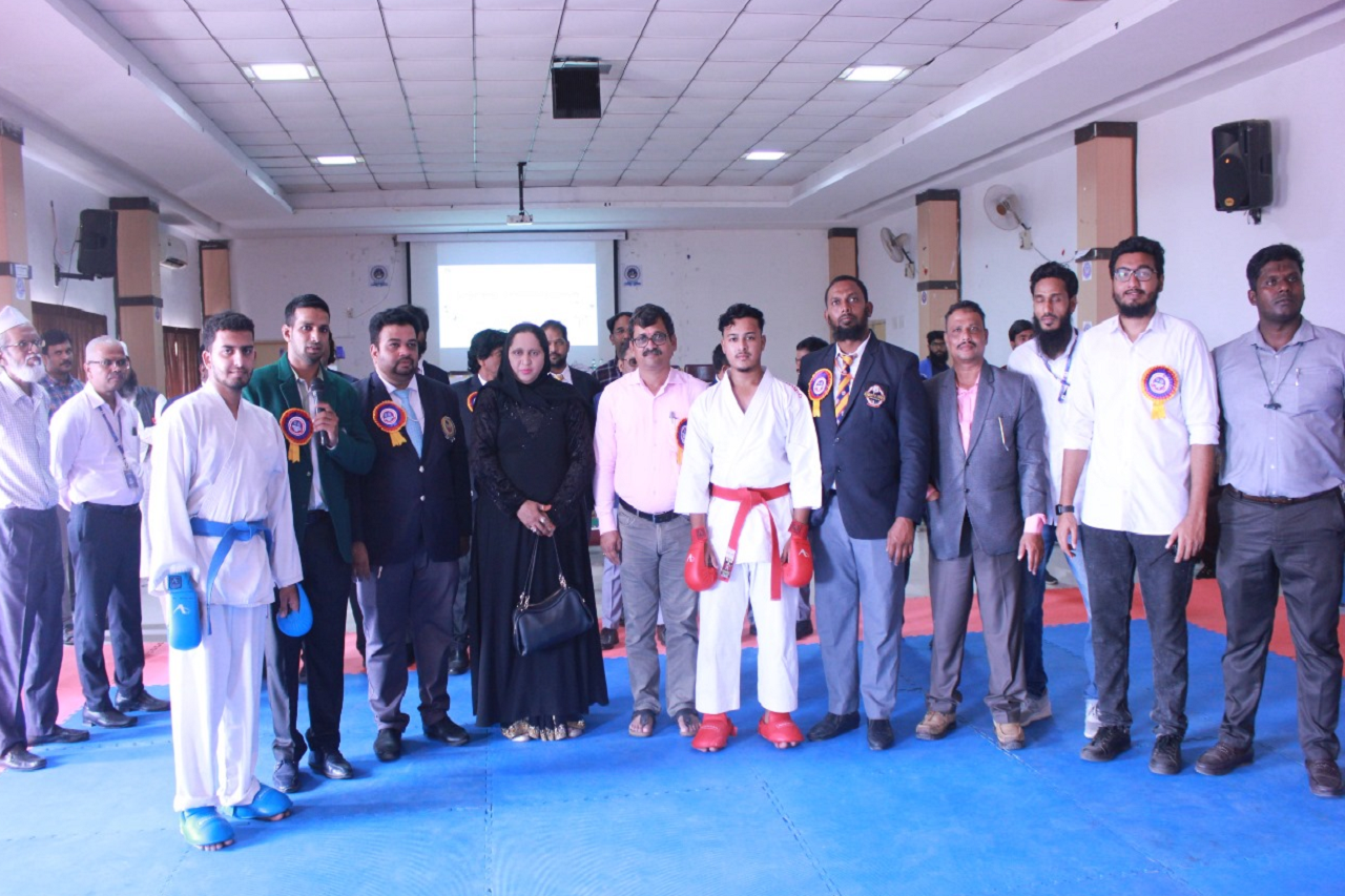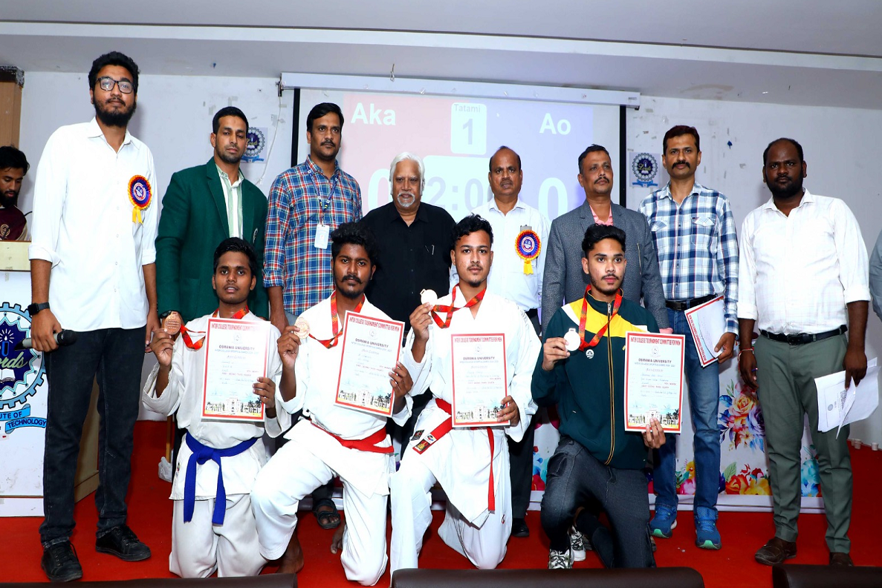 Description: Lords Institute of Engineering Technology (A) hosted the Osmania University Inter-College Karate Tournament on its campus on November 2, 2024, with 40 colleges participating. The event, which also served as the OU team selection trial, saw Lords Institute secure the overall championship title, earning two gold medals and one silver. Mohammed Huzaifa Sharif, a second-year ECE student, won gold in both the -84 kg and KATA individual categories, while Ismail Fazal claimed silver in the +84 kg category. Both athletes are selected to represent OU in the South Zone Inter-University Tournament at LNCIT University, Bhopal, from November 16 to 20, 2024.The event was graced by Chief Guest Prof. K. Deepla, IUT Secretary of the Department of Physical Education at Osmania University, and Guest of Honour Prof. Rajesh Kumar, ICT Secretary of the Department of Physical Education and Dean of Student Affairs. The tournament was observed by Mr. Aditya Reddy, appointed by OU.