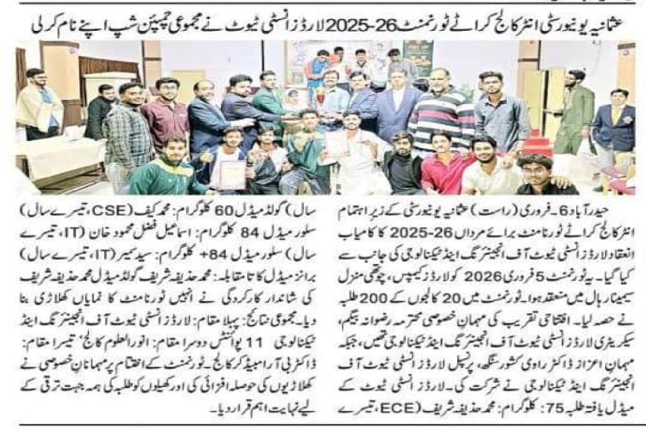 Description: The Sports & Games Cell of Lords Institute of Engineering and Technology (A) successfully organized the Osmania University Inter-College Karate Tournament for Men 2025β26 on 05 February 2026 at the 4th Floor Seminar Hall, Lords Campus. The tournament saw enthusiastic participation from 20 colleges, with nearly 200 students competing in Kumite and Kata events across various weight categories.
