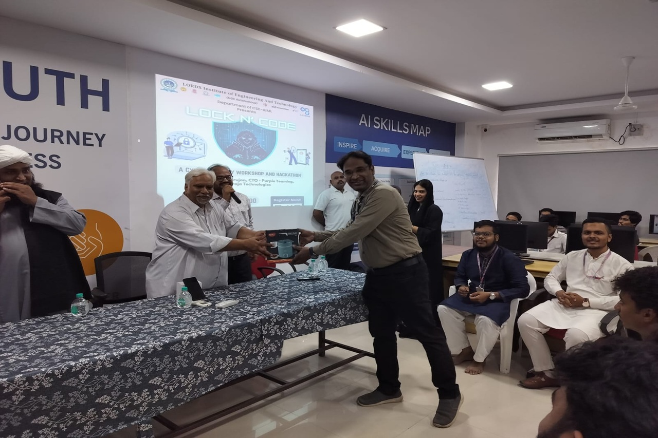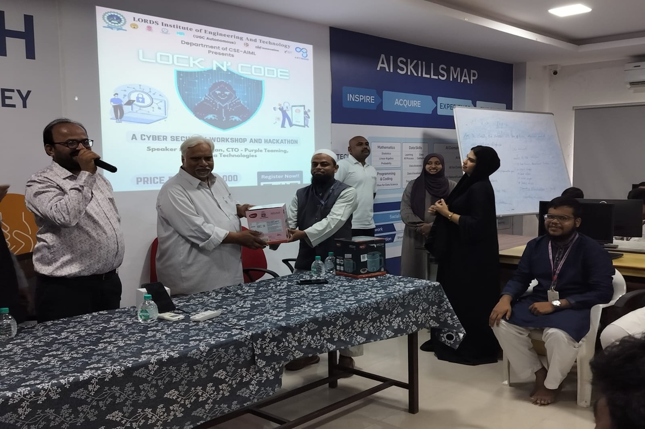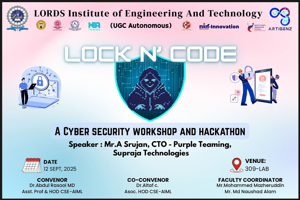 Description: The Department of Computer Science and Engineering (Artificial Intelligence & Machine Learning), Lords Institute of Engineering and Technology (Autonomous), organized an engaging event “LOCK N’ CODE – A Cyber Security Workshop and Hackathon” on 12th September 2025 in Lab–309.