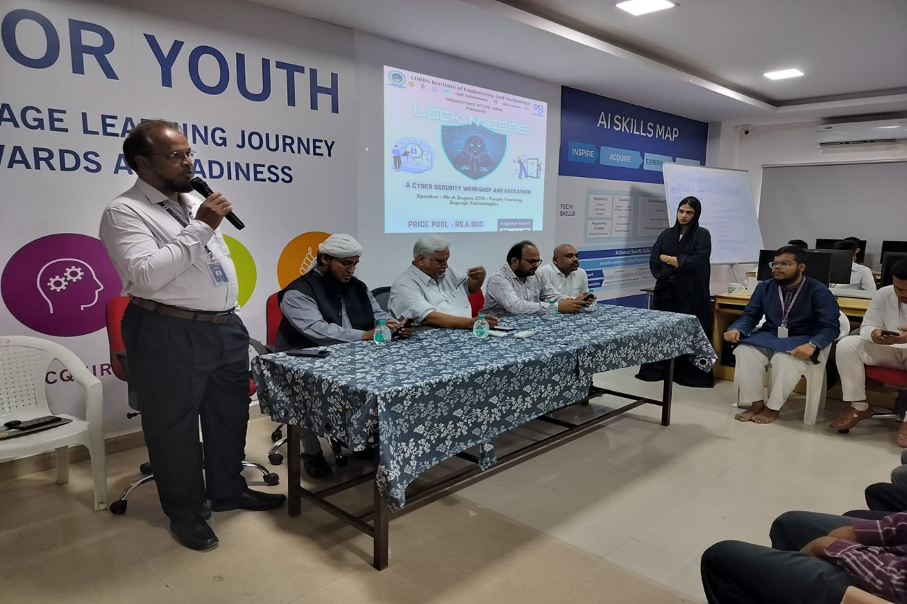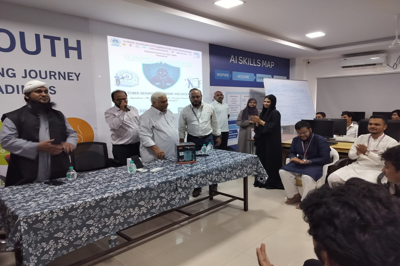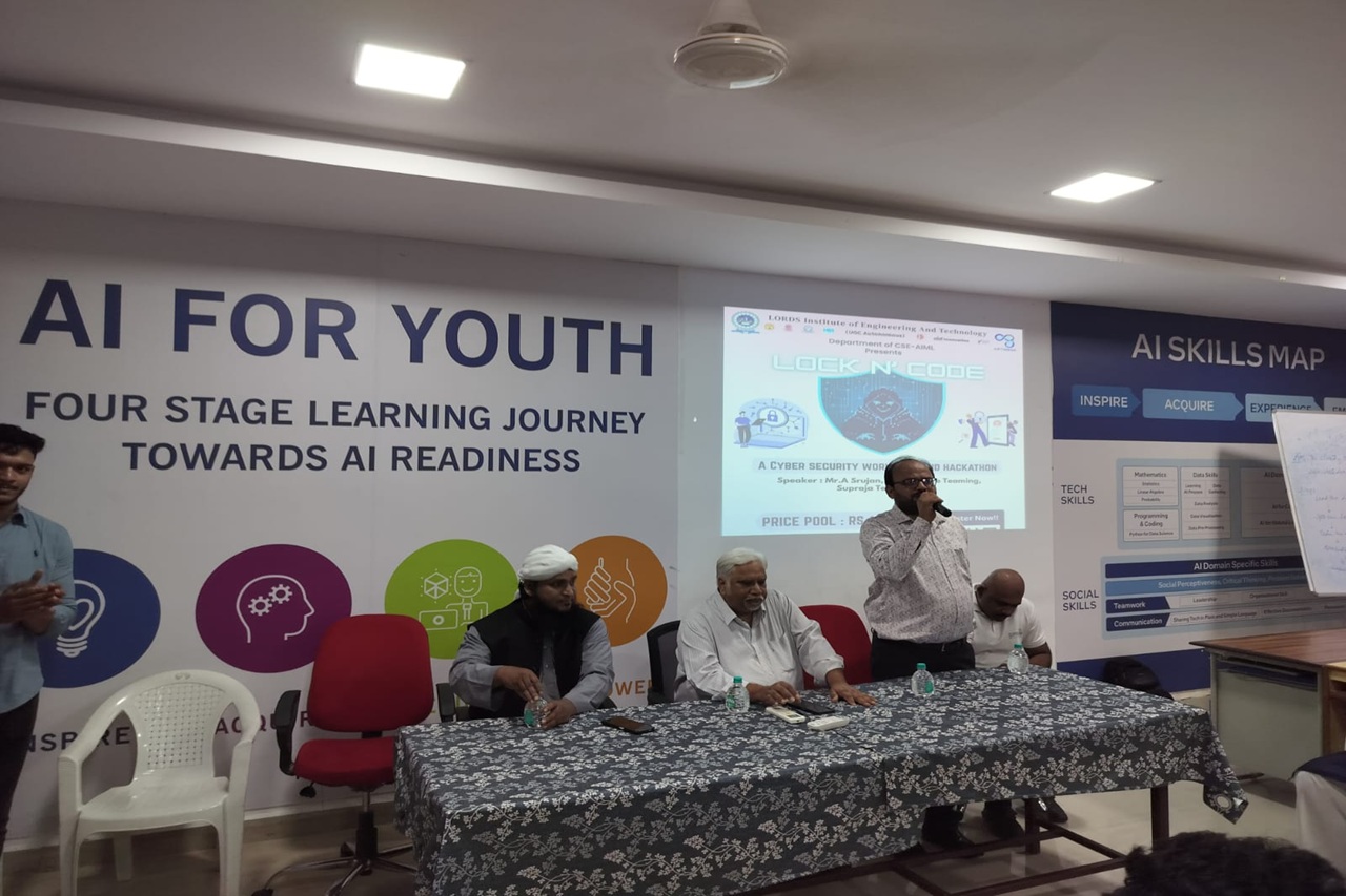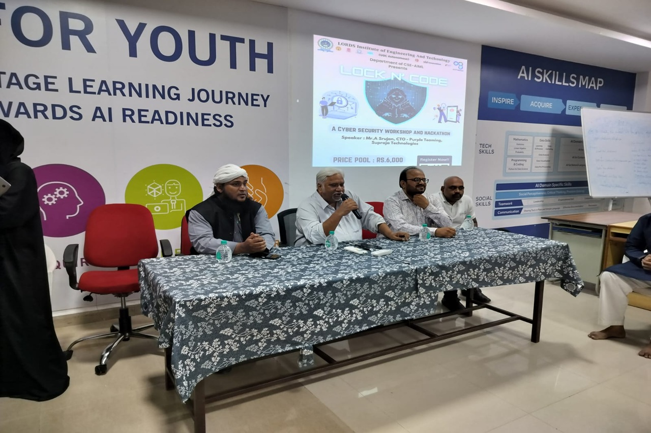 Description: The Department of Computer Science and Engineering (Artificial Intelligence & Machine Learning), Lords Institute of Engineering and Technology (Autonomous), organized an engaging event “LOCK N’ CODE – A Cyber Security Workshop and Hackathon” on 12th September 2025 in Lab–309.