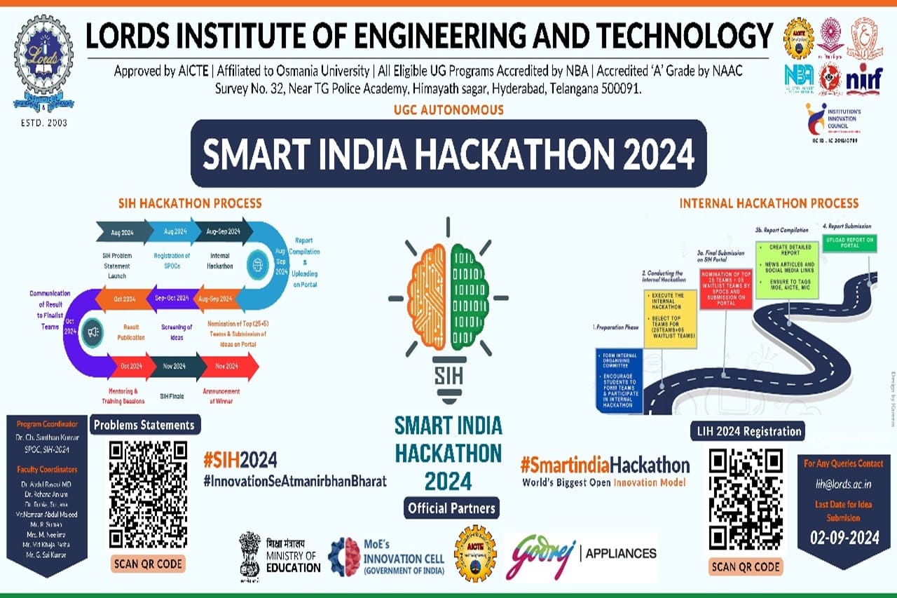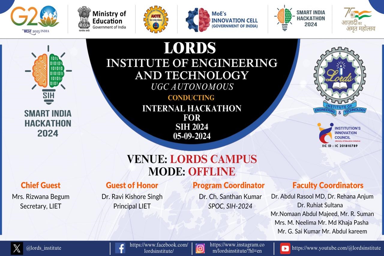 Description: Lords Institute of Engineering and Technology organized Lords Internal Hackathon (LIH 2024) for the Smart India Hackathon (SIH 2024) is a pivotal event that fosters innovation and creativity among students offering them a platform to solve real-world problems through technology. This hackathon is organized to identify and nurture the best talent within our institution and prepare them for the larger SIH, a national initiative to promote problem-solving skills and develop innovative solutions for industry and government challenges. A Grand Inauguration in the August presence of the Management & Principal is followed by a 40+ teams presentation to the 3 Panels of Jury Members. The event concluded with certificate distribution to all the participants.