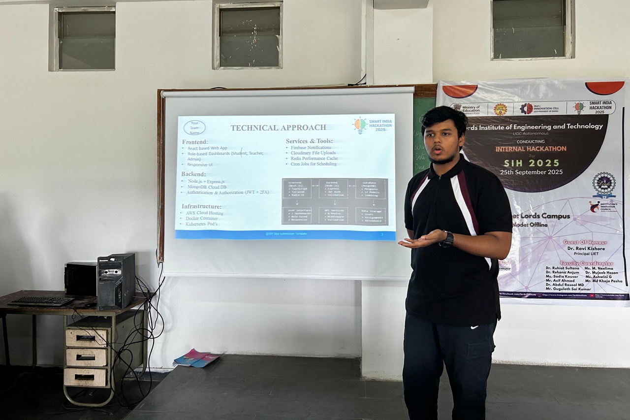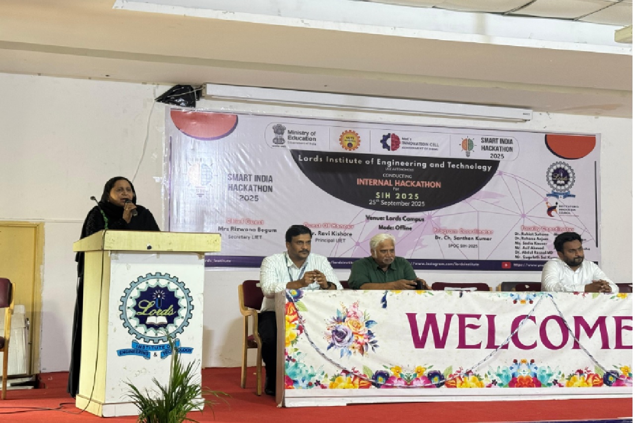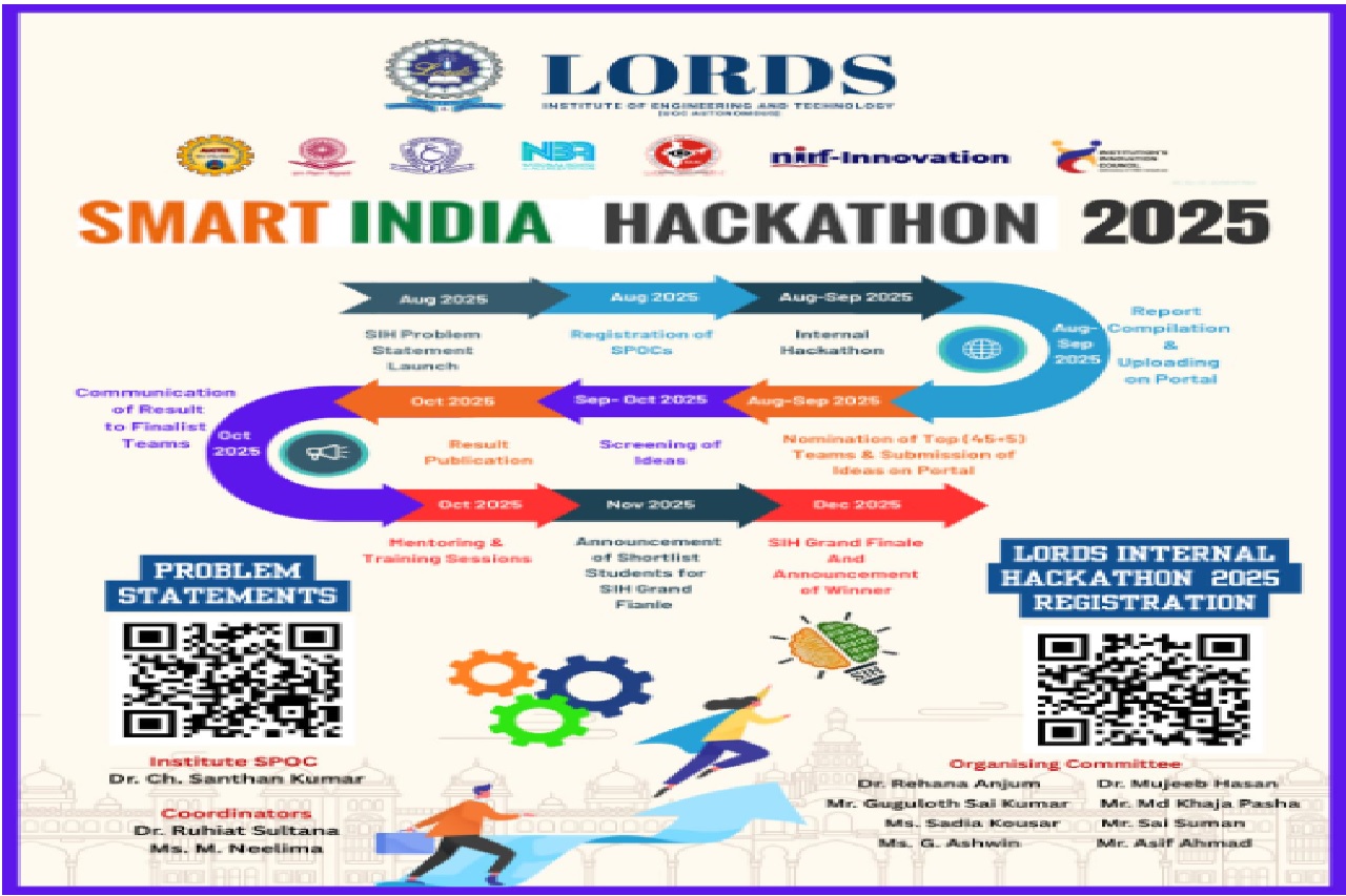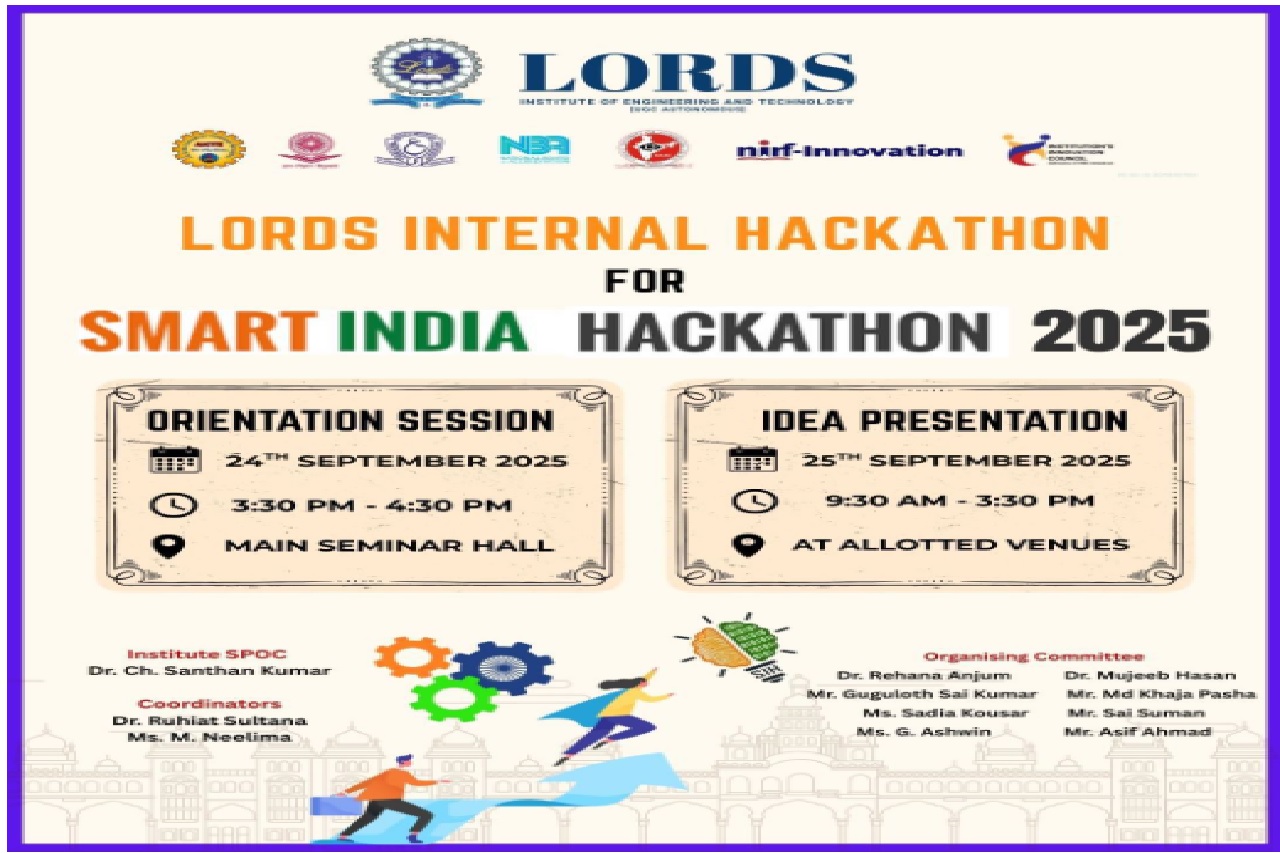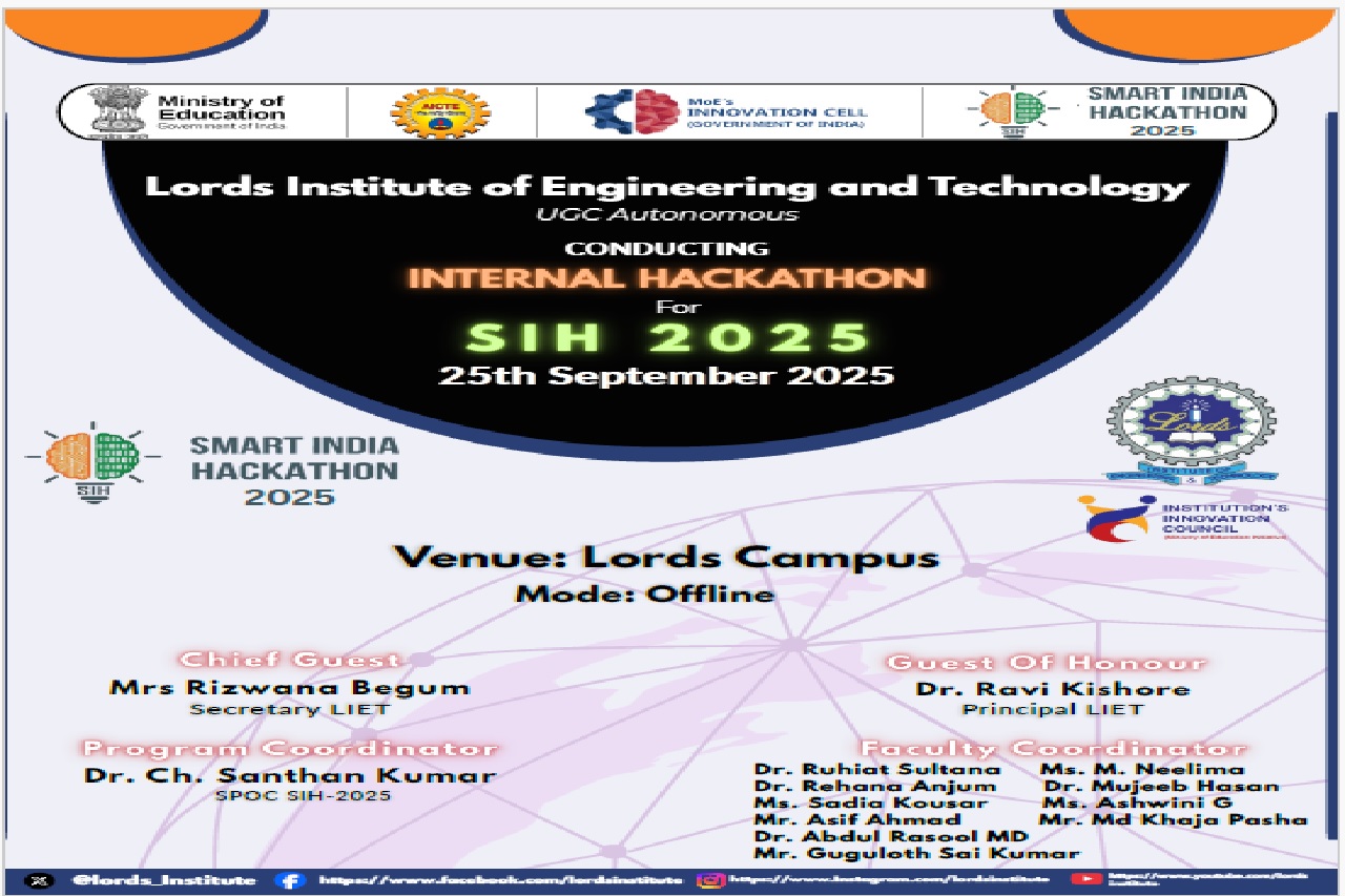Description: Lords Institute of Engineering and Technology organized the Internal Hackathon 2025 for the Smart India Hackathon (SIH 2025) β a pivotal event aimed at fostering innovation and creativity among students by providing them a platform to solve real-world problems through technology.