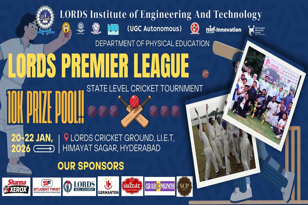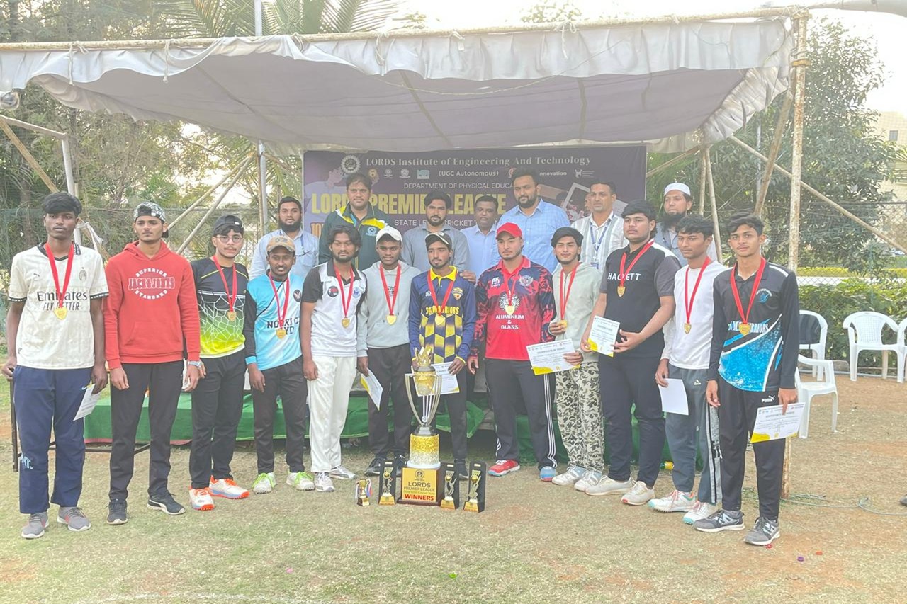 Description: The Lords Premium League (LPL) State Level Cricket Tournament 2026 was successfully organized by the Sports and Games Cell, Lords Institute of Engineering and Technology (A) from 20th to 22nd January 2026, with matches held daily from 7:30 AM to 6:00 PM. The tournament witnessed enthusiastic participation from 20 colleges, with 300 students competing. The opening ceremony was graced by Mr. Abrar Moinuddin, a current Ranji Trophy and IPL player, as the Chief Guest, and Lt. Col. M. F. Nasir of the Indian Army as the Guest of Honour. OSM Degree College emerged as the winner, while Nawab Shah Alam Engineering College secured the runner-up position. The event successfully fostered sportsmanship, student interaction, and a positive learning atmosphere on campus.