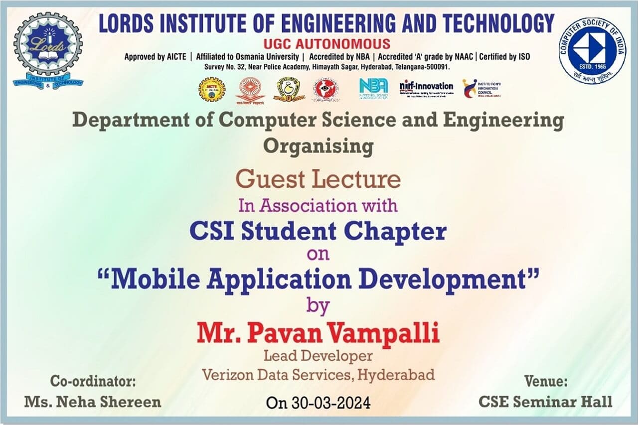 Resource Person: Mr. Pavan Vampalli is Guest Speaker from Lead Developer from Verizon Data Services, Hyderabad in association with student Chapter on Mobile Application Development on 30.03.2024 at Lords, Seminar Hall. Description about the event (50 Words): A Technical seminar was on Mobile Application Development is the process of creating software applications that run on mobile devices, and a typical mobile application utilizes a network connection to work with remote computing resources. here are two dominant platforms in the modern smartphone market. One is the iOS platform from Apple Inc. The iOS platform is the operating system that powers Apple’s popular line of iPhone smartphones. The second is Android from Google. The Android operating system is used not only by Google devices but also by many other OEMs to built their own smartphones and other smart devices.Although there are some similarities between these two platforms when building applications, developing for iOS vs. developing for Android involves using different software development kits (SDKs) and different development toolchain. While Apple uses iOS exclusively for its own devices, Google makes Android available to other companies provided they meet specific requirements such as including certain Google applications on the devices they ship. Developers can build apps for hundreds of millions of devices by targeting both of these platforms.