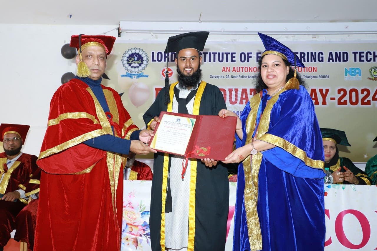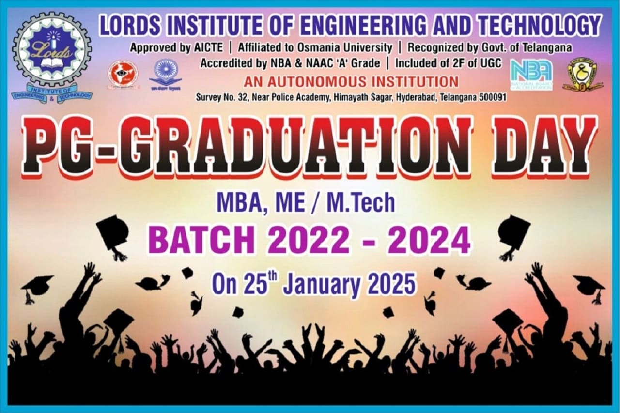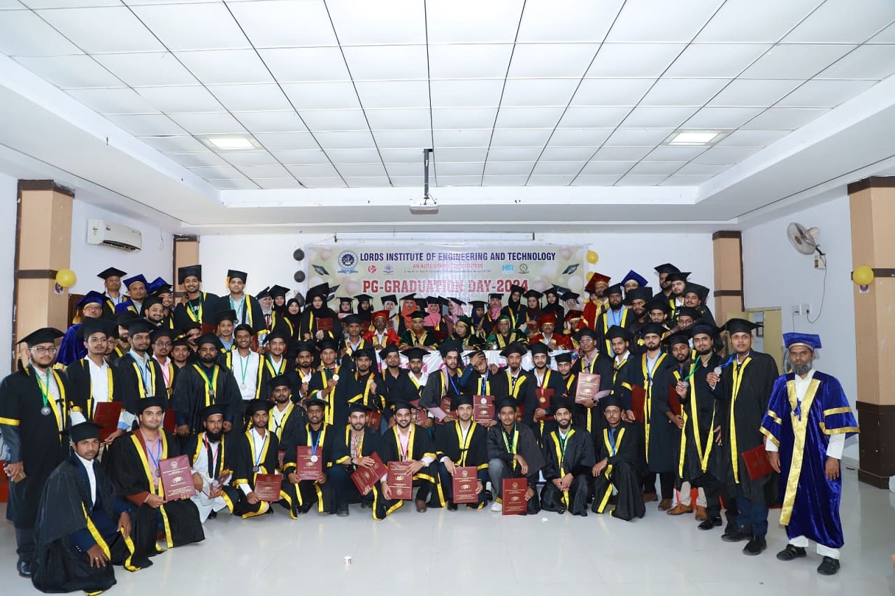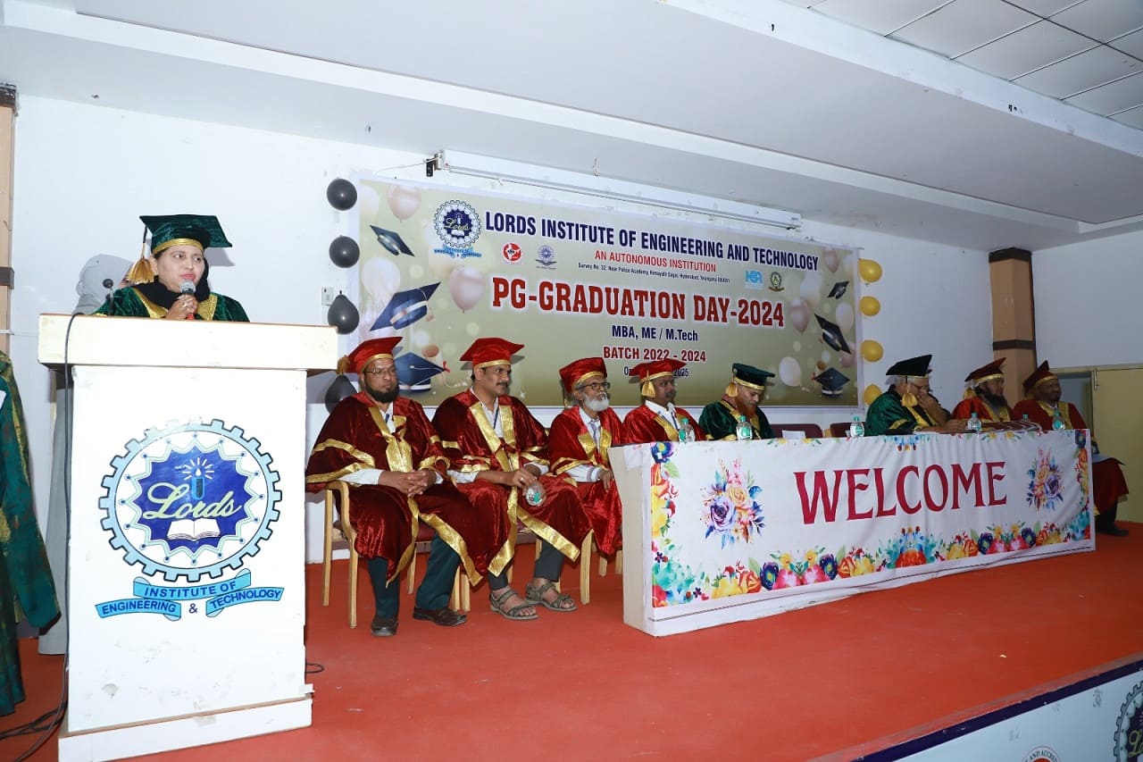 Description: Lords Institute of Engineering and Technology has organised “PG Graduation Day Ceremony” for MBA, ME, &M.Tech. Students of the Batch: 2022-2024, on Saturday, 25th January 2025 at 11.00 AM. The event was graced by the Esteemed Secretary of LIET, Mrs Rizwana Begum; and other Eminent & Honourable Members of LIET; Principal, Dr Ravi Kishore Singh, Vice-Principal, Dr.Syed Azam Pasha Quadri ,Deans, HODs and staff members. MBA,ME&M.Tech.Branchesstudents who achieved Academic Excellence were awarded with Gold Medals, silver medals and Graduation certificates. LIET Secretary, Mrs.Rizwana Begum, gave valuable advice to the Graduated students and motivated the students to work with Integrity& Honesty for the sustainable development of our country. Principal Dr. Ravi Kishore Sigh also suggested students to work hard to become future entrepreneurs & leaders.More than 150 MBA, ME & M.Tech. Students along with their parents participated in the event. The event was ended with some Graduated Students sharing their experience while studying at LIET, and with the Vote of thanks to all the dignitaries & parents who were present on PG Graduation Day.