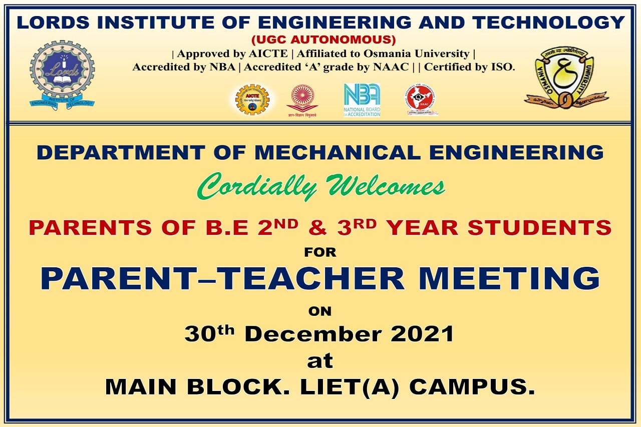 Events Mech Parents Teachers Meet 2K21 admin December 31, 2021 Name of the Event: Parent Teacher meeting Department / Cell : Mechanical Engineering Date : 30/12/2021 Venue: First Floor Main Building No of parents attended : 45 ← EEE Parents Teacher Meet 2K21 IT Parent Teacher meeting 2K21 →