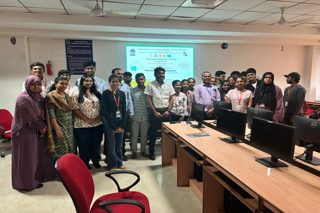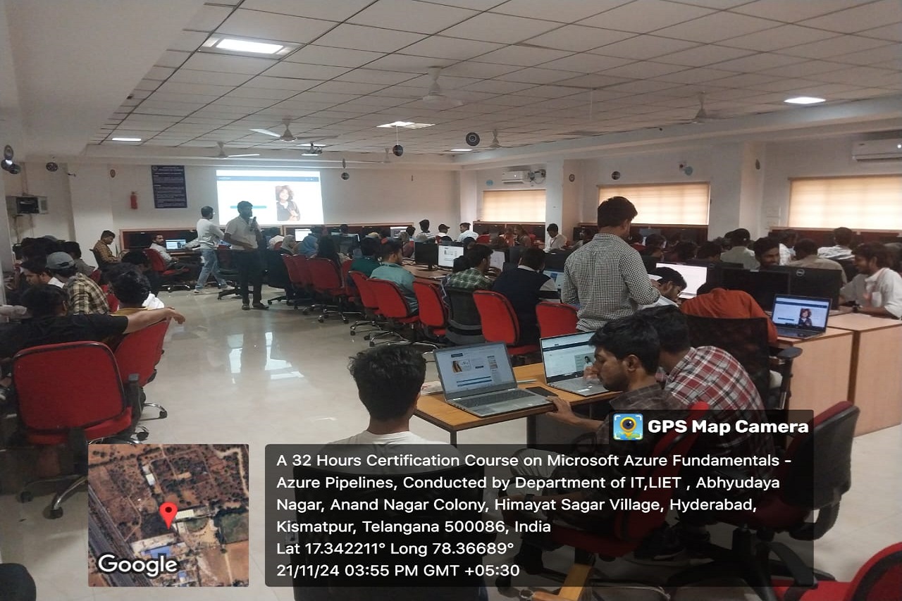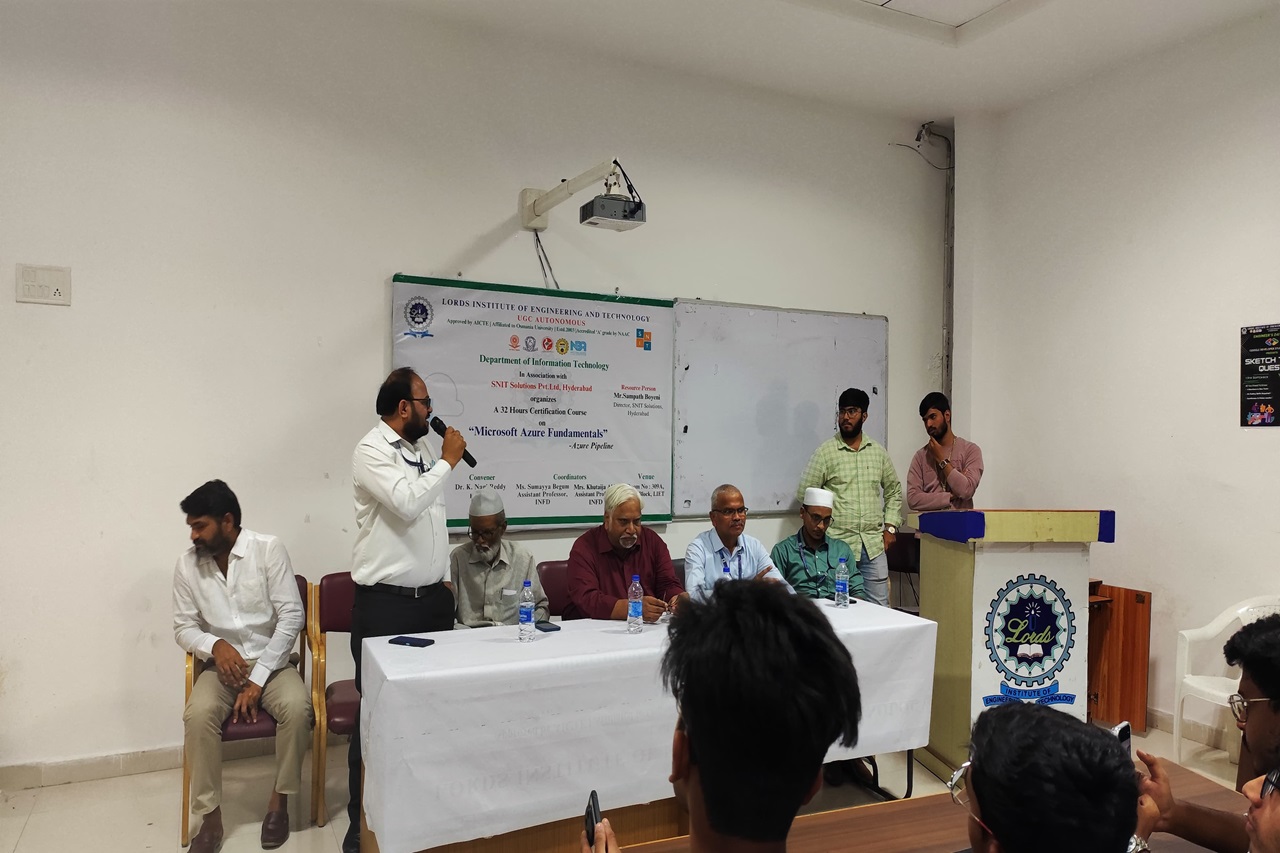 The Department of Information Technology at Lords Institute of Engineering and Technology (A) organized a 32-Hour Certification Course on Microsoft Azure Fundamentals – Azure Pipelines, held from 5th Nov to 22nd Nov. The course was conducted by Mr. Sampath Boyeni, Director at SNIT Solutions, Hyderabad. Aimed at 3rd-year students, there are 24 students from other colleges such as VJIT, MLRITM, KMEC and Matrusi Engineering College.It has provided hands-on experience and essential knowledge on Microsoft Azure Fundamentals.All the participants of Certification Course have attempted the exam and have certified on Microsoft Azure Fundamentals. A Microsoft Azure Fundamentals certification course is designed to help individuals understand cloud computing basics and how they apply to Microsoft Azure, Microsoft’s cloud platform. It is ideal for those starting in cloud computing or looking to enhance their skills with Microsoft Azure. The certification exam associated with this course is Exam AZ-900: Microsoft Certified: Azure Fundamentals. The event saw the participation of 87 students.