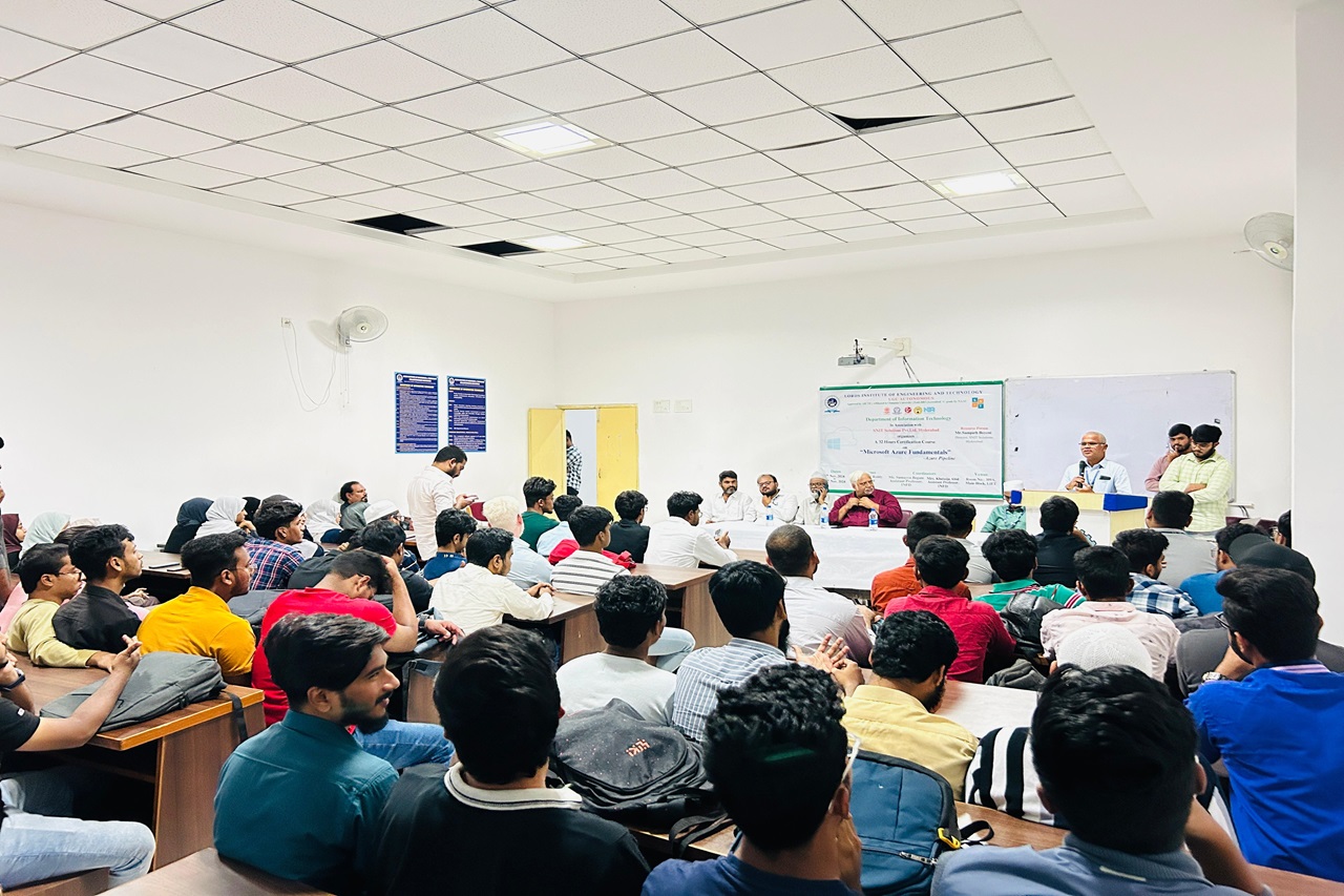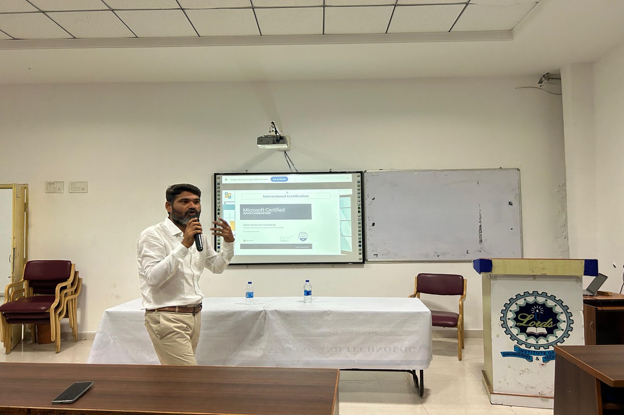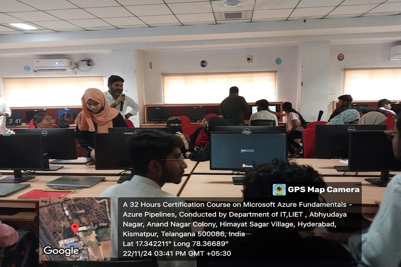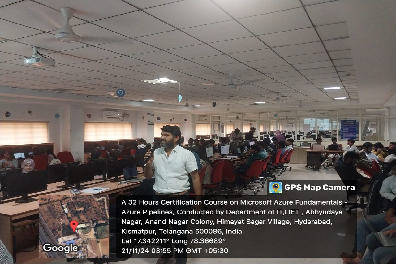 The Department of Information Technology at Lords Institute of Engineering and Technology (A) organized a 32-Hour Certification Course on Microsoft Azure Fundamentals – Azure Pipelines, held from 5th Nov to 22nd Nov. The course was conducted by Mr. Sampath Boyeni, Director at SNIT Solutions, Hyderabad. Aimed at 3rd-year students, there are 24 students from other colleges such as VJIT, MLRITM, KMEC and Matrusi Engineering College.It has provided hands-on experience and essential knowledge on Microsoft Azure Fundamentals.All the participants of Certification Course have attempted the exam and have certified on Microsoft Azure Fundamentals. A Microsoft Azure Fundamentals certification course is designed to help individuals understand cloud computing basics and how they apply to Microsoft Azure, Microsoft’s cloud platform. It is ideal for those starting in cloud computing or looking to enhance their skills with Microsoft Azure. The certification exam associated with this course is Exam AZ-900: Microsoft Certified: Azure Fundamentals. The event saw the participation of 87 students.