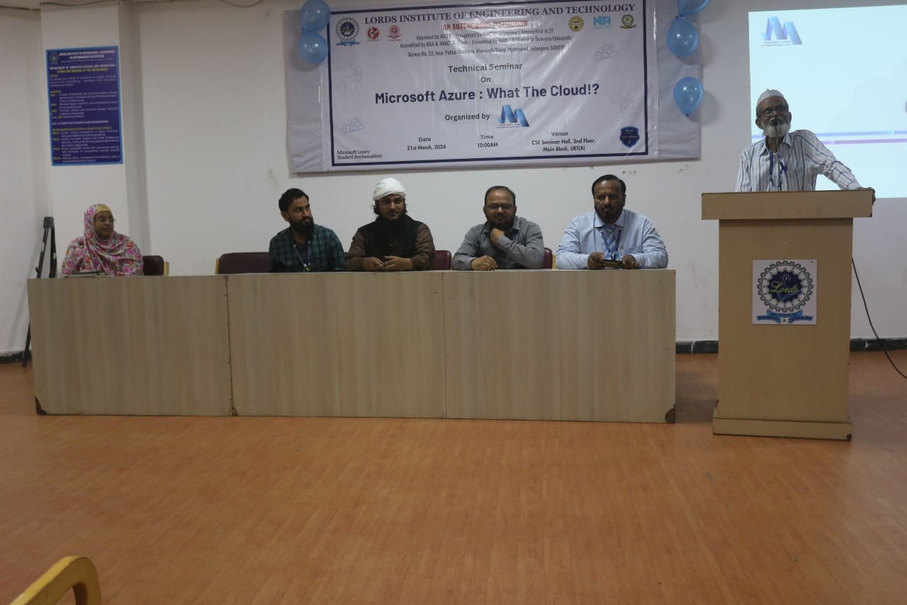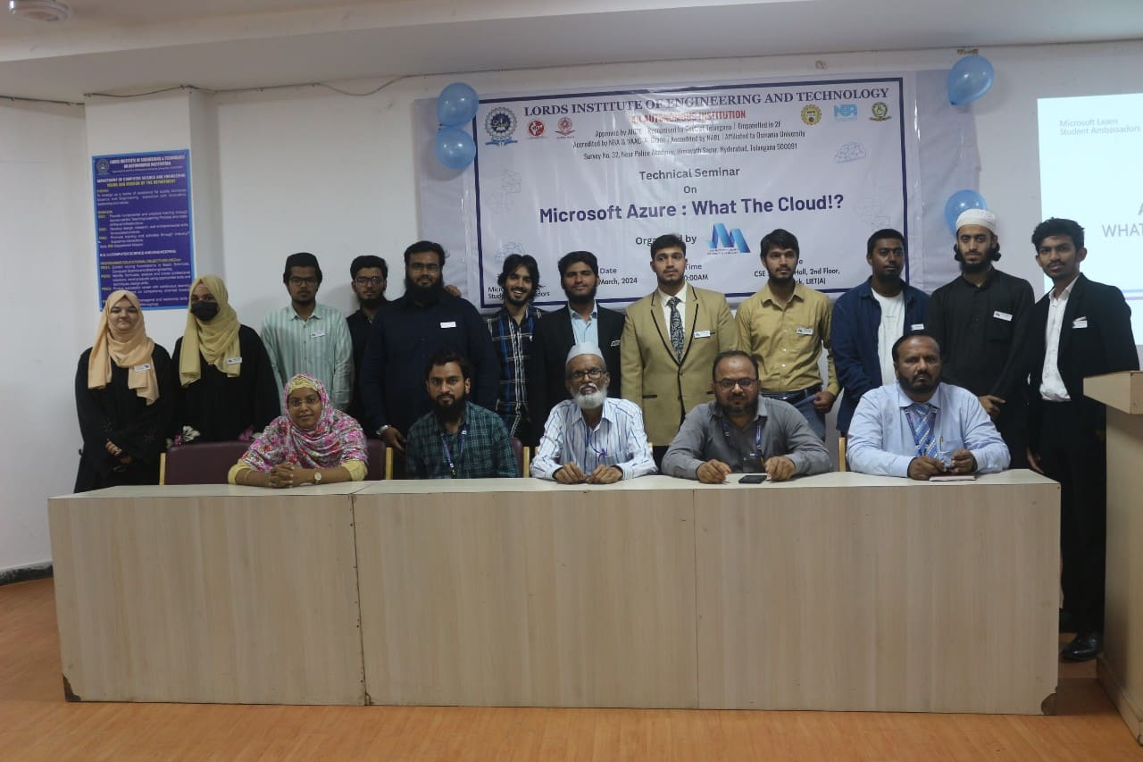 Description: The Department of CSE-AIML at Lords Institute of Engineering and Technology (A), in collaboration with Microsoft Learn Students Hub, organized a technical seminar titled “Microsoft Azure: What The Cloud!?” on March 21, 2024. The seminar aimed to instill a basic understanding of Cloud Computing and fundamental concepts of Microsoft Azure among attendees. Through impactful speeches and presentations by senior faculty, MLSA members, and Hub representatives, the session successfully equipped 120 participating students with fundamental skills in Microsoft Azure and Cloud Computing.
