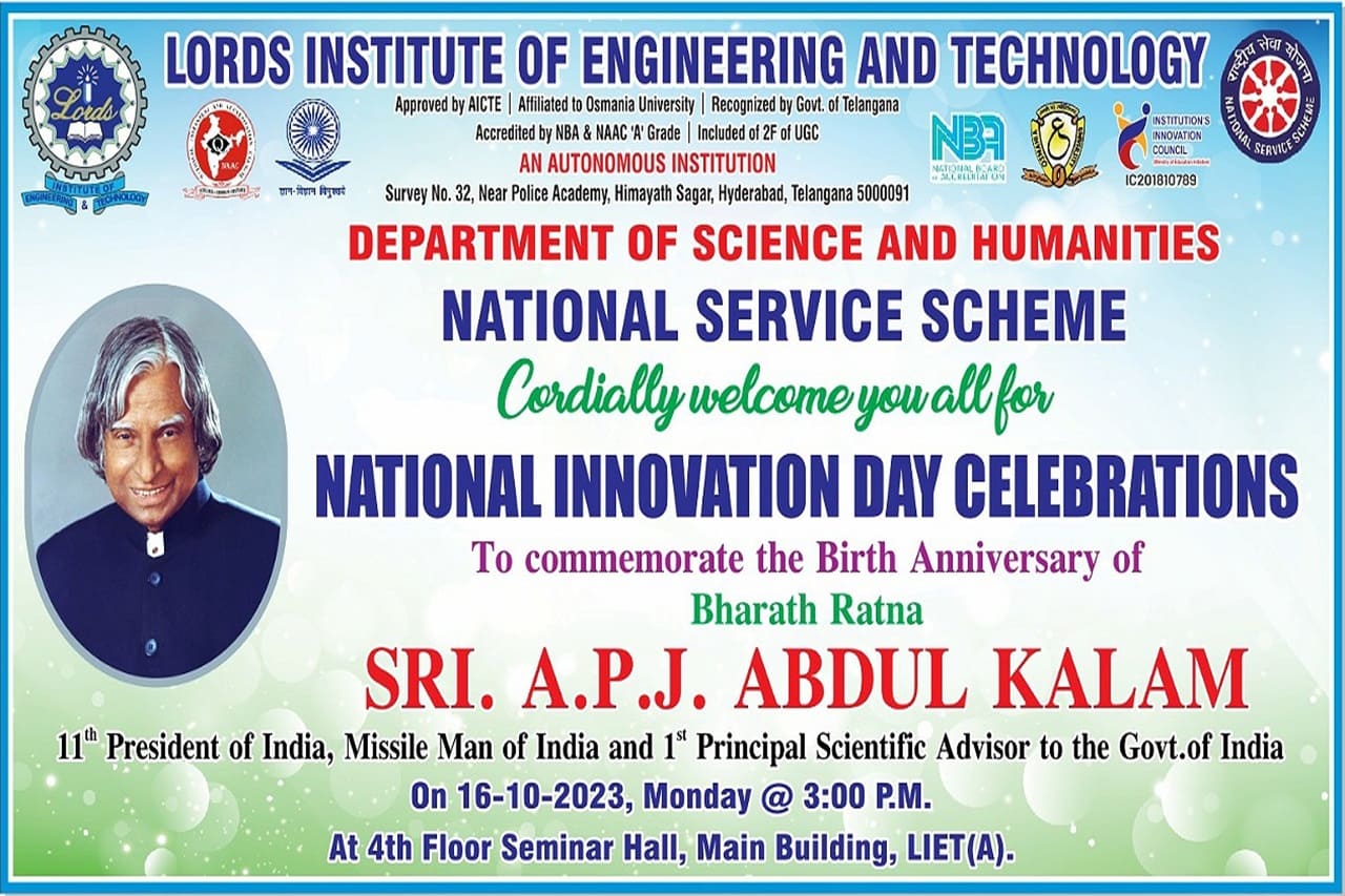 Description: The Department of Science and Humanities at LIET [A] commemorated National Innovation Day on October 16, 2023, at the 4th Floor Seminar Hall in the Main Building. The event was organized to honor inventors who drive progress in the realms of science and technology and to inspire individuals to embrace innovative thinking. First-year students actively participated in various competitions like essay writing, elocution, drawing, painting, and prizes were awarded by Dr. Ravi Kishore Singh, the Principal of LIET. Additionally, the Dean of the First Year, in a captivating presentation, highlighted the remarkable innovations and creative ideas of APJ Abdul Kalam, urging students to unleash their potential and push the boundaries of their abilities.