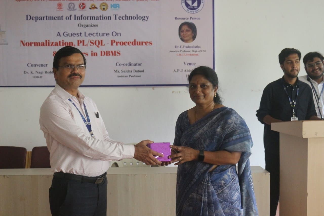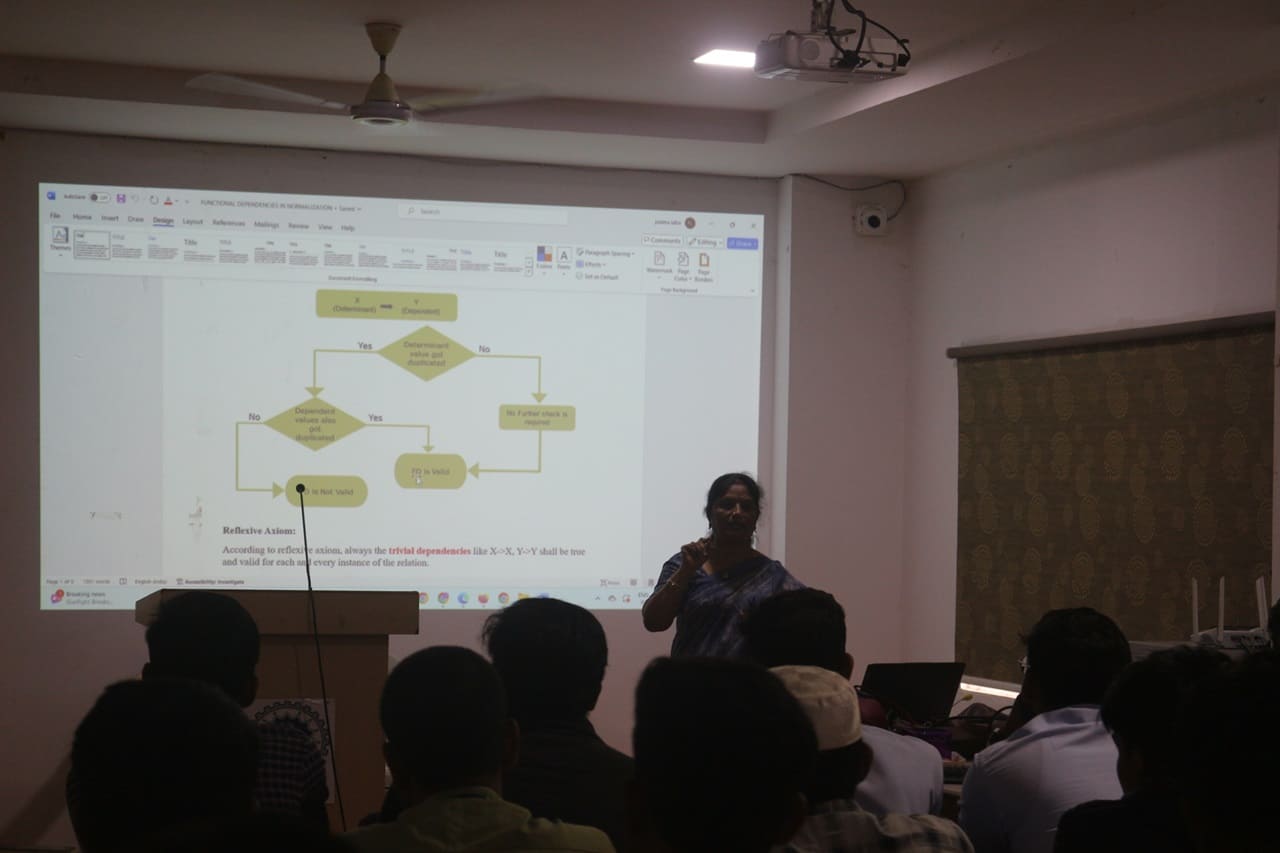 Description: The guest lecture was very informative and insightful. The resource person discussed the importance of normalization in organizing data efficiently in a database to minimize redundancy and improve data integrity. They explained the different normal forms and how they help in structuring databases effectively.In terms of PL/SQL, the lecture highlighted how it extends SQL by adding procedural capabilities, allowing for the creation of stored procedures, functions, and triggers within Oracle databases. The resource person demonstrated the use of PL/SQL blocks for writing procedural code to perform tasks like control structures, loops, and exception handling. The resource person showcased how procedures can be stored in the database and called by applications to execute specific tasks. Lastly, the discussion on triggers focused on their significance in automatically executing actions in response to specific events in the database, such as INSERT, UPDATE, or DELETE operations.