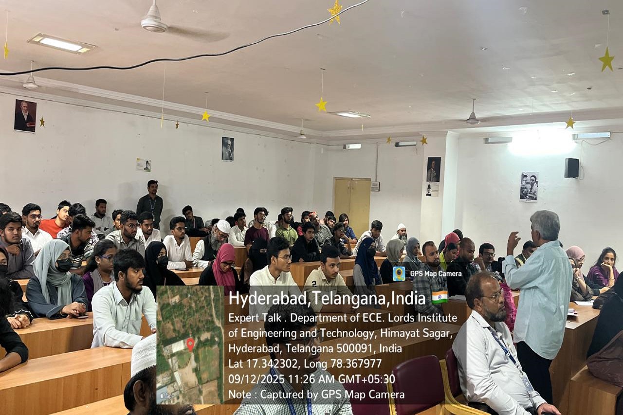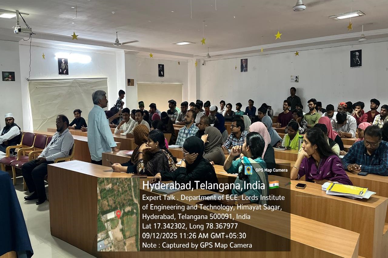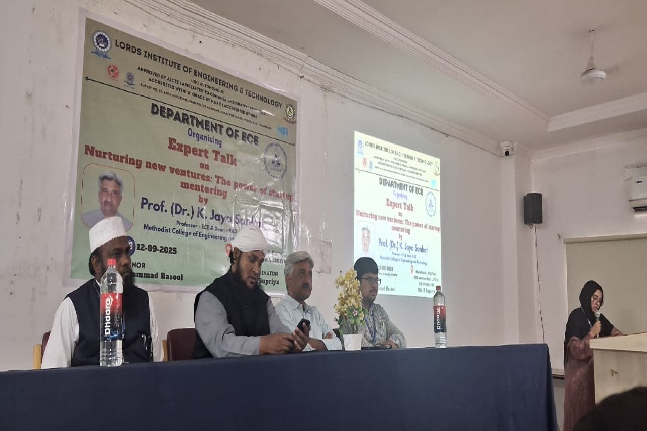 Description:The department of ECE,Lords Institute of Engineering and Technology organised an expert talk on “Nurturing New Ventures: The Power of Startups” was delivered by Prof. (Dr.) K. Jaya Sankar, Prof,Dean R&D ,Methodist College of Engineering and Technology on 12-09-2025.The event had a strength of 62 students and 26 faculty. Speaker highlighted key aspects such as teamwork, financial resources, government schemes, risk management, and passion factor importance. The session emphasized innovation, entrepreneurship and the importance of mentoring and relationships in building successful startups.