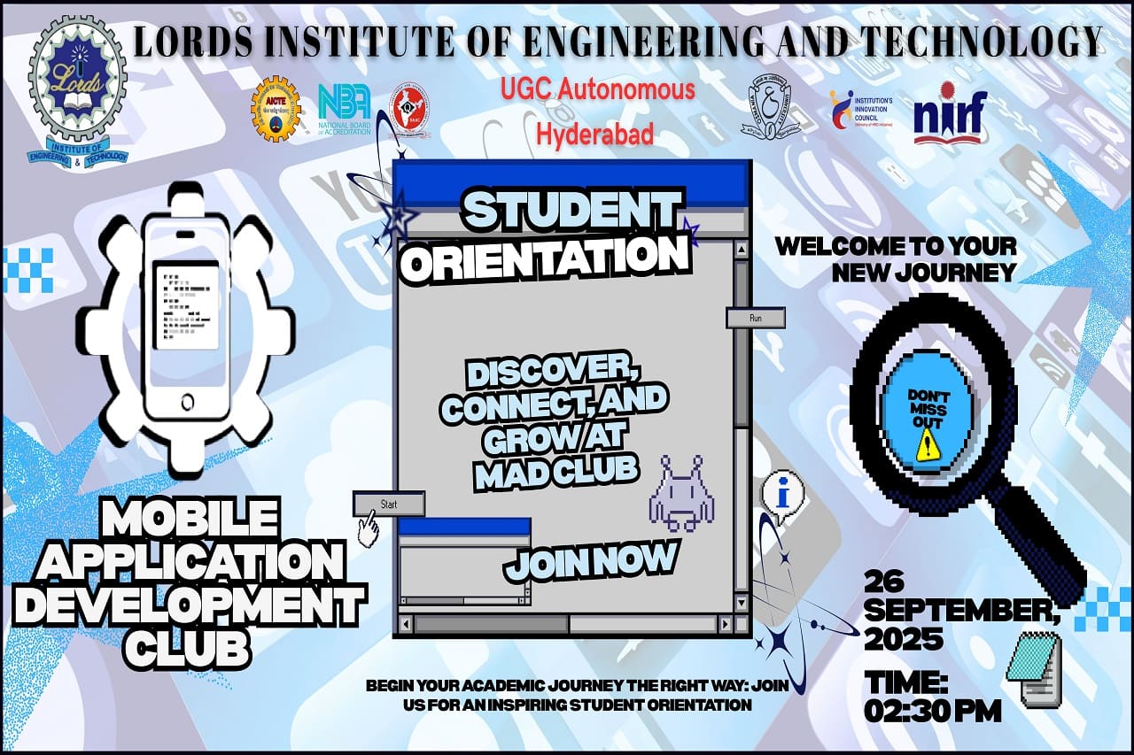 Description: On 26th September 2025, the Mobile Application Development (MAD) Club of Lord’s Institute of Engineering and Technology conducted an engaging Orientation Session for first-year students. The session introduced students to the club’s vision, core team, and activities, offering insights into mobile app development and opportunities to learn, build, and showcase innovative ideas. It also guided students on how to become active members and explore hands-on learning through the club’s initiatives.